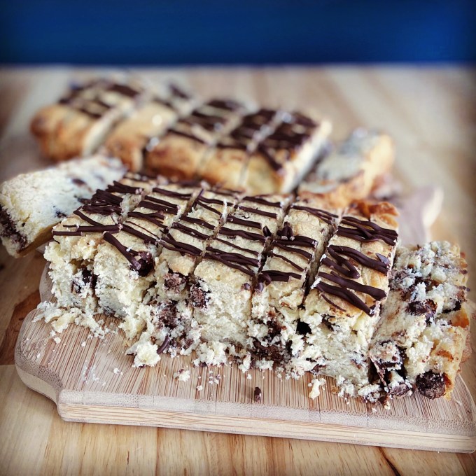 I found a recipe for chocolate chip shortbread in this month’s Food Network Magazine. A few years ago my sister accidentally made a great chocolate chip shortbread recipe that I’ve been hoping to recreate. The problem is, she doesn’t remember what she did to make it so great. She *thinks* she may have accidentally added an egg or two. So when I saw this recipe, I had to try it (with the addition of egg, of course).
