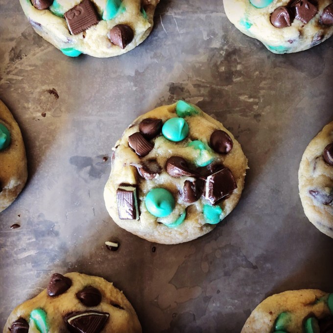 The original recipe I followed for these cookies is no exception. It’s based off a recipe my grandma sent me for peppermint cookies. I hate peppermint so I decided to swap mint extract for the peppermint extract and Andes Candies for peppermint pieces. Going against my gut (because the cookies in the pictures looked so damn good – thick and fluffy), I attempted the all-butter recipe and was, once again, disappointed. Never again. I swear! But with a few tweaks I believe I nailed the recipe the second time around.