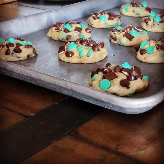 3. Use a cookie scoop to scoop dough. Dip tops into Andes Candies. Place candy-side up on a baking sheet. (Note: This doesn’t work if you’re using Andes Candies instead of peppermint. They melt all over the place and generally look terrible once you pull them from the oven. Skip this step. Instead throw the Andes Candies into the mix along with the chocolate chips.) Bake in center oven for 10 to 13 minutes, until puffy (never going to happen) and lightly tanned.