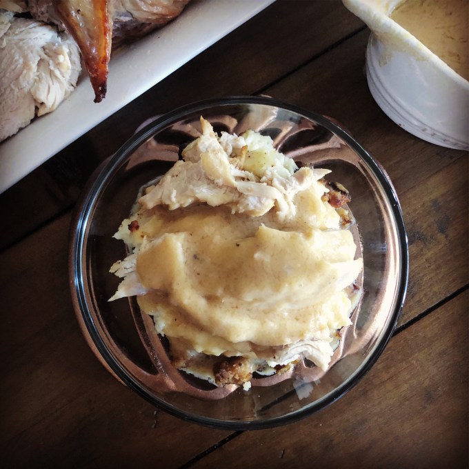 You can do this a few ways. You can layer mashed gravy on top stuffing on top turkey on top mashed potatoes in a bowl, cover in plastic wrap (if you’re not afraid of toxins) and reheat in the microwave for two or three minutes. Or, if you’re a super fatty like I am, you can place a layer of mashed potatoes in the bowl, then top with gravy, then add some turkey, top with more gravy, layer with stuffing (make it a thick layer) and finish it off with another layer of gravy – then heat in the micro.