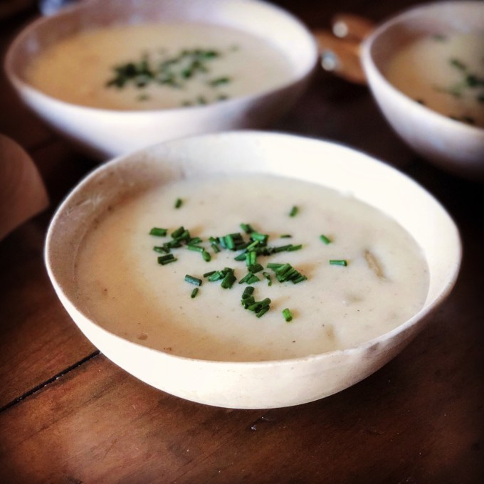 - If you haven’t already used your half-and-half, add now or add remaining; gently rewarm but do not boil on low heat. (This will take a while. I let mine simmer on the stove for a few hours – maybe two or three.) Season with salt and white pepper. Garnish with chives when serving. (Use fresh if you can find them. I had to use dried.)