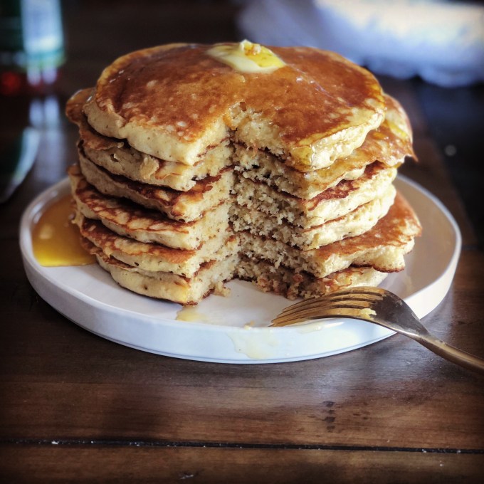 These may be my new favorite pancakes. Thick, healthy-tasting, slightly sweet and completely hearty – they won’t leave you hungry. Especially if you eat almost the entire recipe. Like I did. (I told you they were my new favorite! And in my defense, the recipe only makes about 6 five-inch pancakes.)