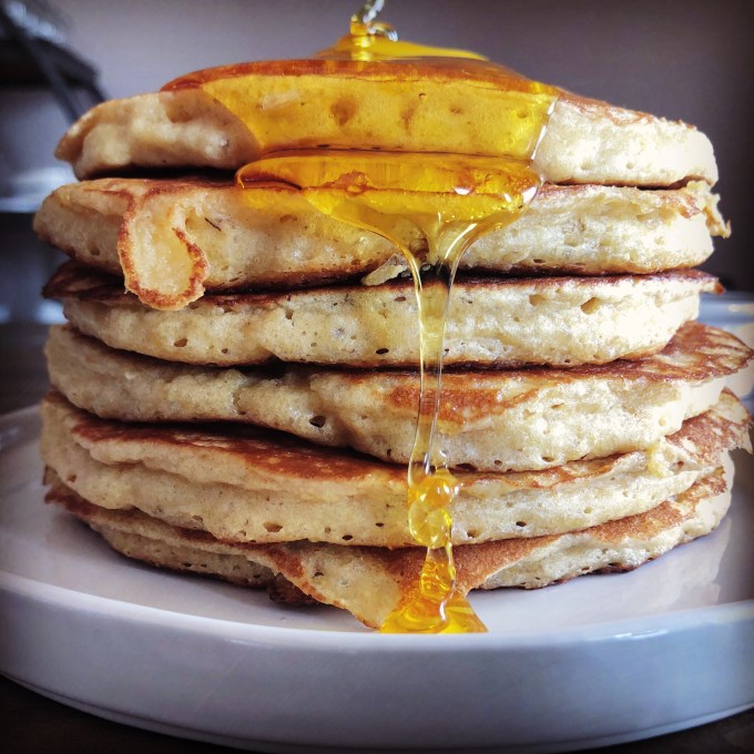 - Spoon batter onto a hot nonstick griddle or frying pan using a soup ladle. (I fry mine in cast-iron skillets on medium low heat coated in oil.) Turn pancakes when tops are covered with bubbles and edges look cooked. Serve with maple syrup and low-fat granola if desired. (Granola? That’s weird. I served mine with butter and Golden Syrup.)