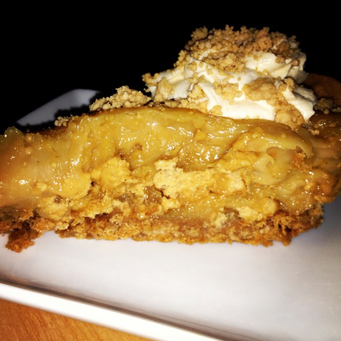 Cut into it I did. I cut myself a huge piece (accidentally, of course) that was probably equal to two normal pieces of pie or three thin slices. And then I dug in. Between the peanut butter crust, peanut butter crumble, peanut butter filling and peanut butter whipped cream, it was a peanut butter explosion. The texture of the cake was a cross between a cream pie and a caramel-like or fudgy sort of texture. A little sticker, perhaps than a cream pie, but good nonetheless. I ate less than half of the huge piece of pie and had to stop.