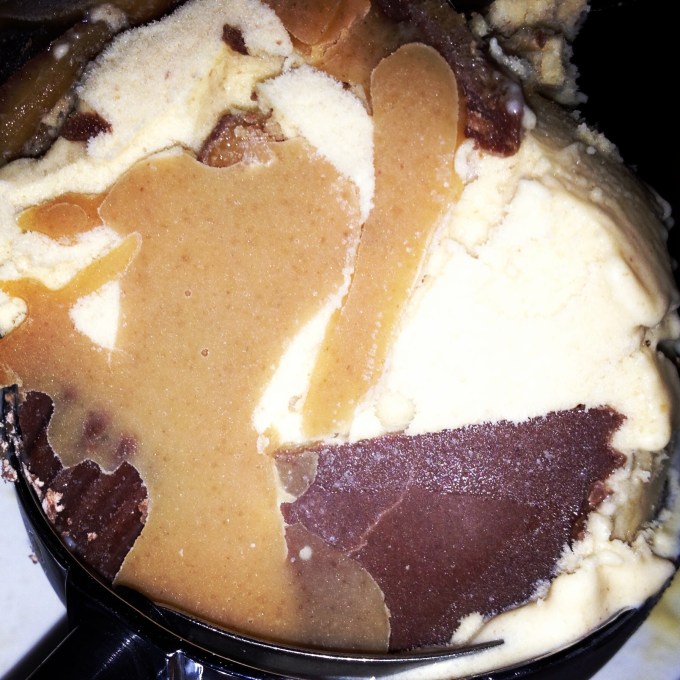 I made a peanut butter sauce by melting the following approximate ingredients in a small pot on the stove: 1 cup of peanut butter, 3 tablespoons butter, 1 tablespoon corn syrup and 1 tablespoon brown sugar. Then I let it cool while I was mixing the ice cream.