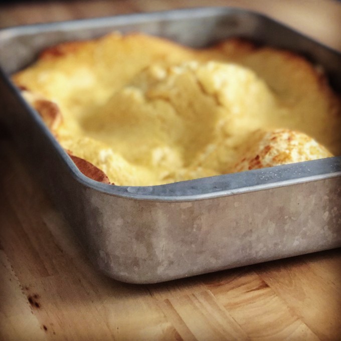 Rooting through my overflow of clipped out recipes sent to me by my grandma, I found a recipe for a Giant Baked Pancake Puff, made in a 13×9-inch pan intended to serve four. Hell. I don’t need that much pancake lying around my house. So I decided to cut the recipe down to an appropriate size for one person – by quartering it – and see if I like this type of pancake more than I did the Finnish Pancake.