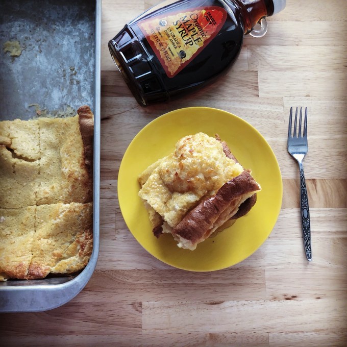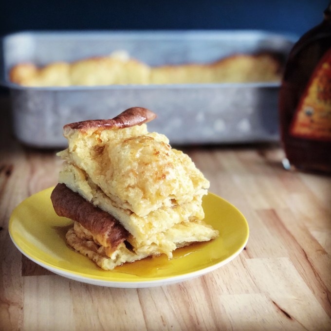 While it works well to quarter the recipe and make a Giant Pancake Puff For One, this time around I decided to make it as intended – in a large casserole dish. My idea was that it would be fun to cut into slices and then stack them up like you would with regular pancakes.