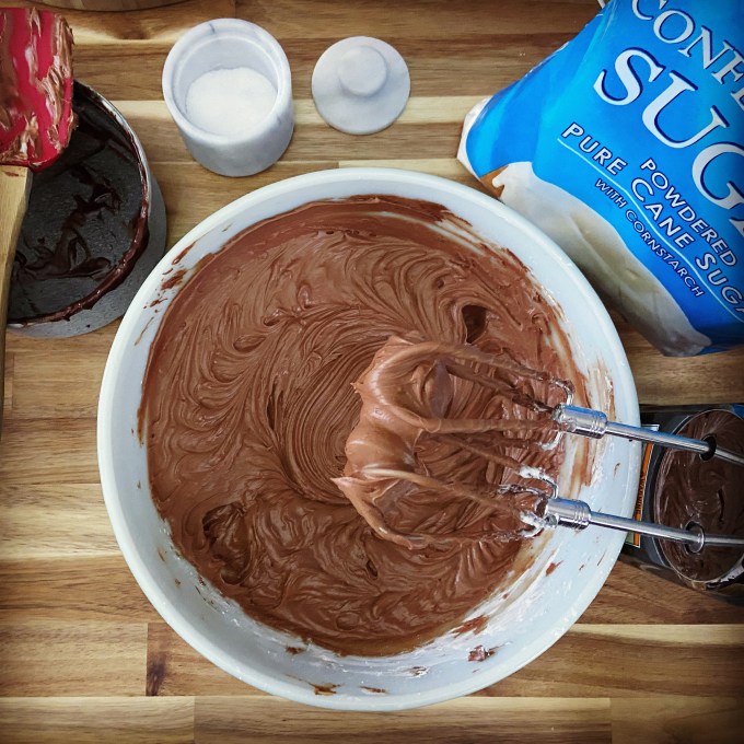 One thing to keep in mind when working with this frosting is that it’s going to harden as it begins to sit, naturally since solids (chocolate chips and butter) make up most of the ingredients. This means you have to work quickly to frost a cake or continue to beat the frosting every so often to loosen it up and make it pliable for frosting.