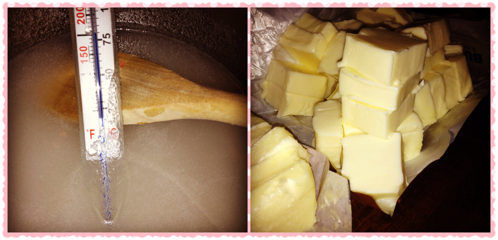 - To make the buttercream, in a medium saucepan over medium heat, combine the sugar and water. Clip a candy thermometer to the side of the pan. Cook the mixture until it reaches 248 degrees F, 5 to 10 minutes, keeping a constant eye on it. (It will bubble up. I would suggest using a big enough pot so that it doesn’t threaten to bubble over on your stove. I used a small saucepan and found it too small.)