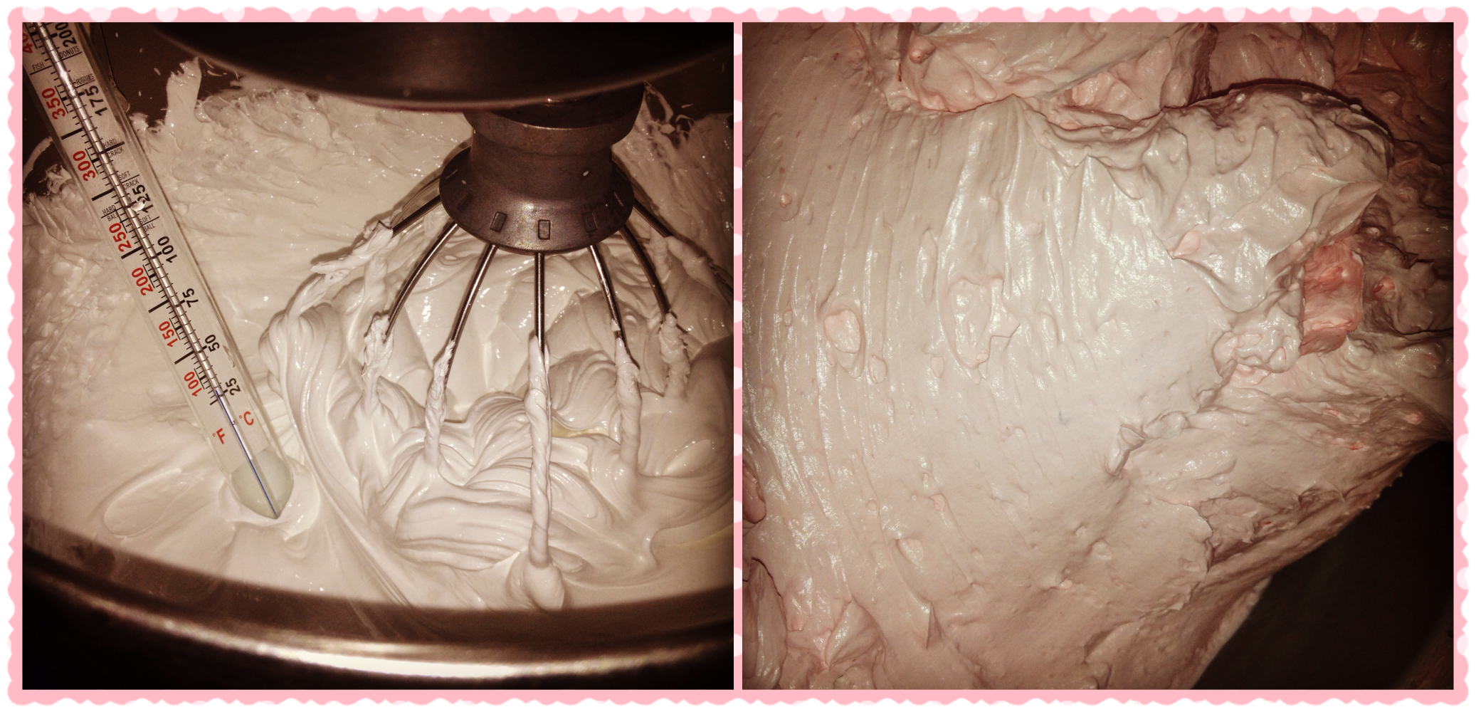 - As soon as the sugar syrup reaches 248 degrees F, immediately pour it into a heat-proof measurer. Pour a few tablespoons into the egg whites, away from the whisk so the hot syrup doesn’t splash, and whisk on medium speed for a few seconds. Be careful as the syrup is very hot. Pour in a little more syrup and whisk for a few seconds until incorporated. Repeat until all the syrup has been added. Raise the speed to high and continue to whisk until the mixture cools to room temperature, 70 to 75 degrees F. (I found this took forever – in part because my mixing bowl is metal and retains heat.)