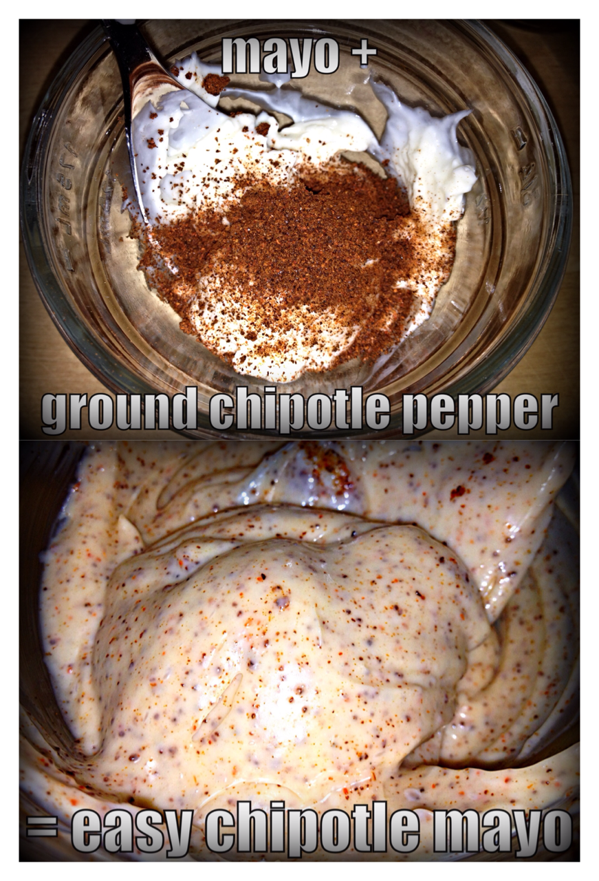 mayoMix a little bit of mayo with some ground chipotle pepper. The more pepper, the bigger the kick.