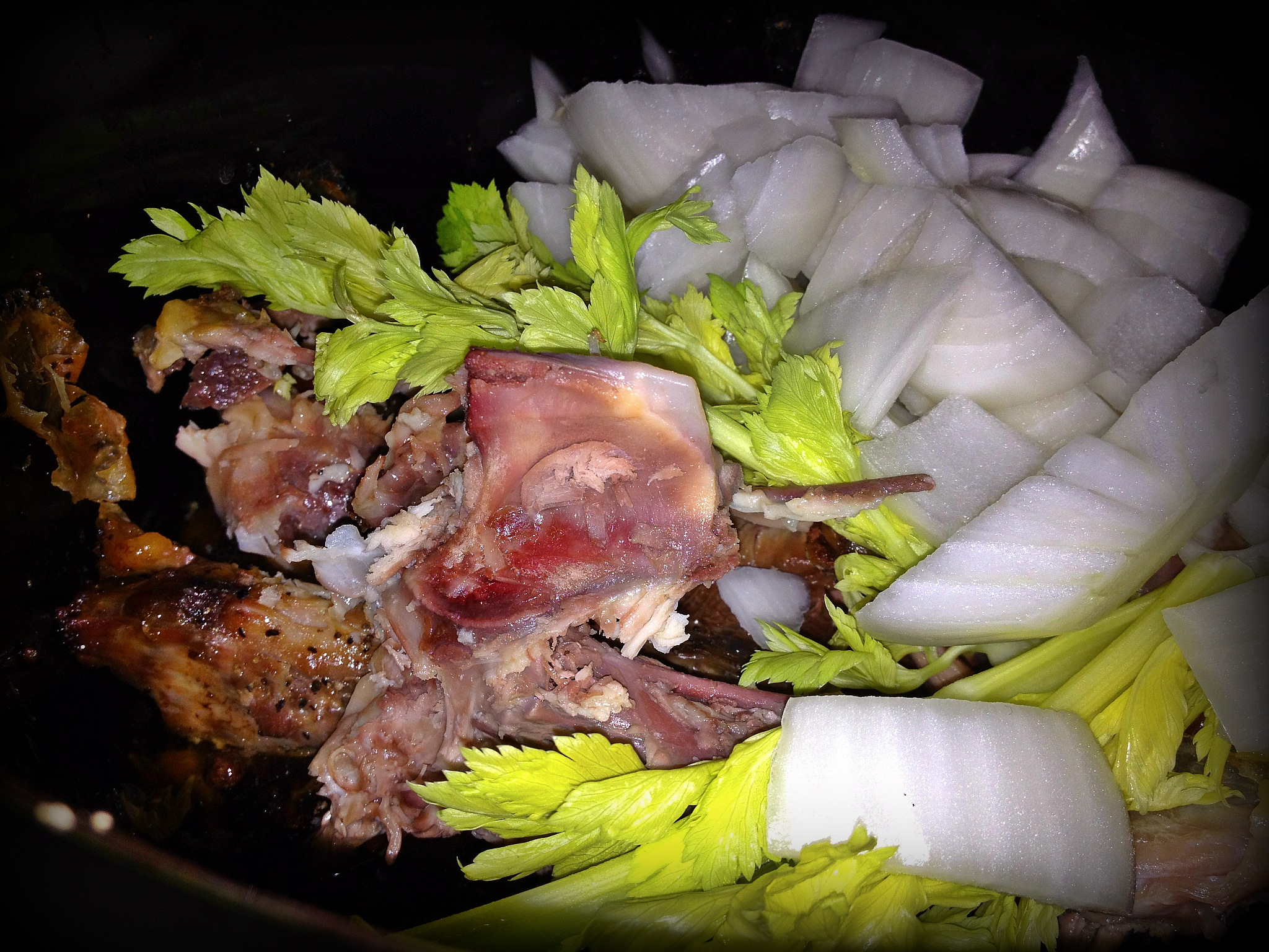 - Leave all juices that have accumulated in the slow cooker. After removing all available meat from the chicken frame, add the bones back into the slow cooker, along with the reserved neck (if using), the bay leaves, onion, peppercorns, allspice, carrots and celery. Add water to an inch from the top, cover and cook on low at least 18 hours but up to 24 hours.