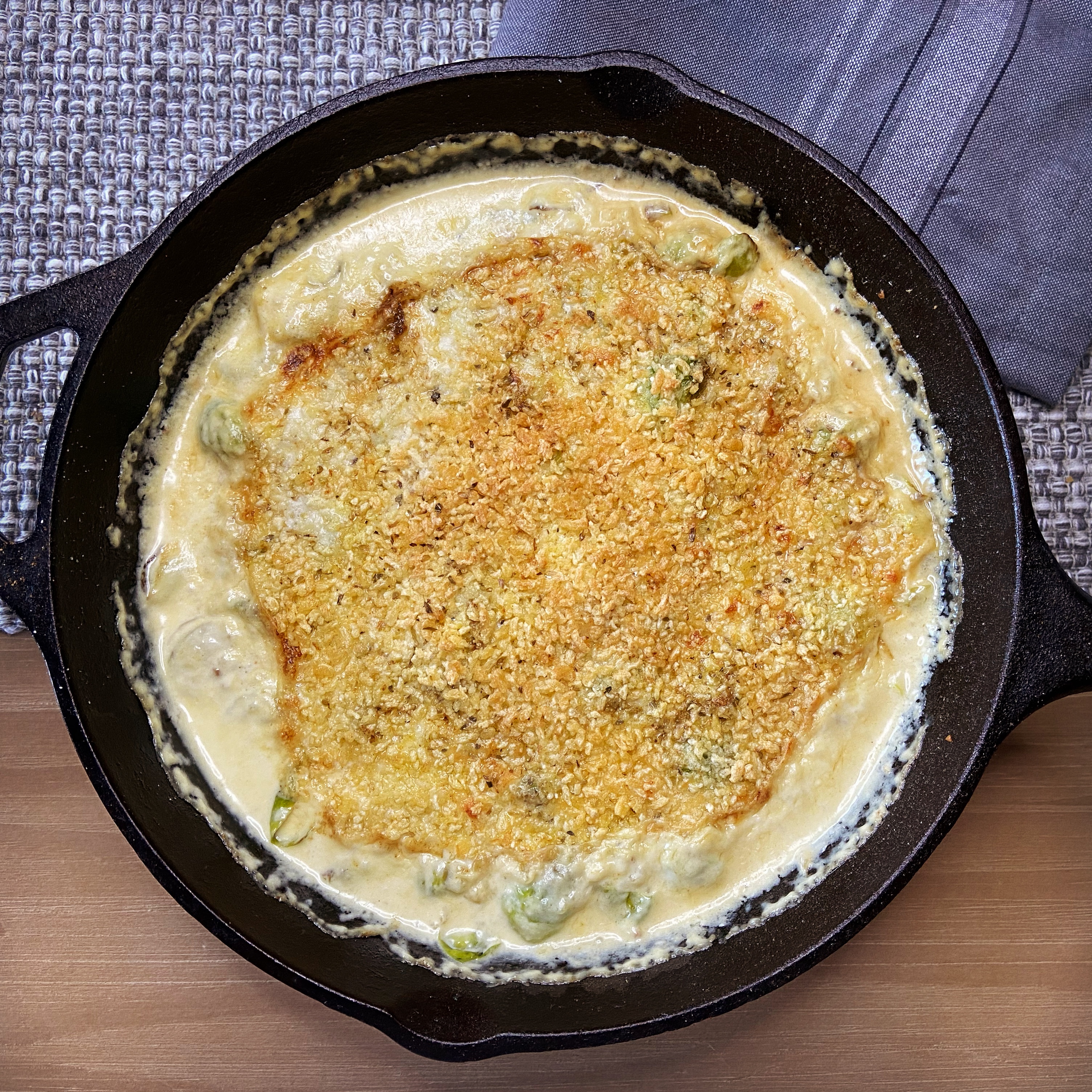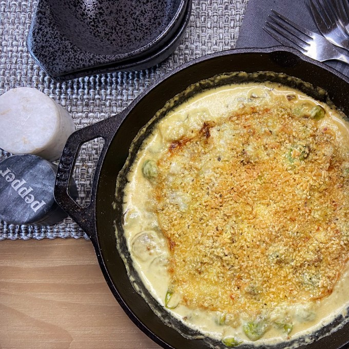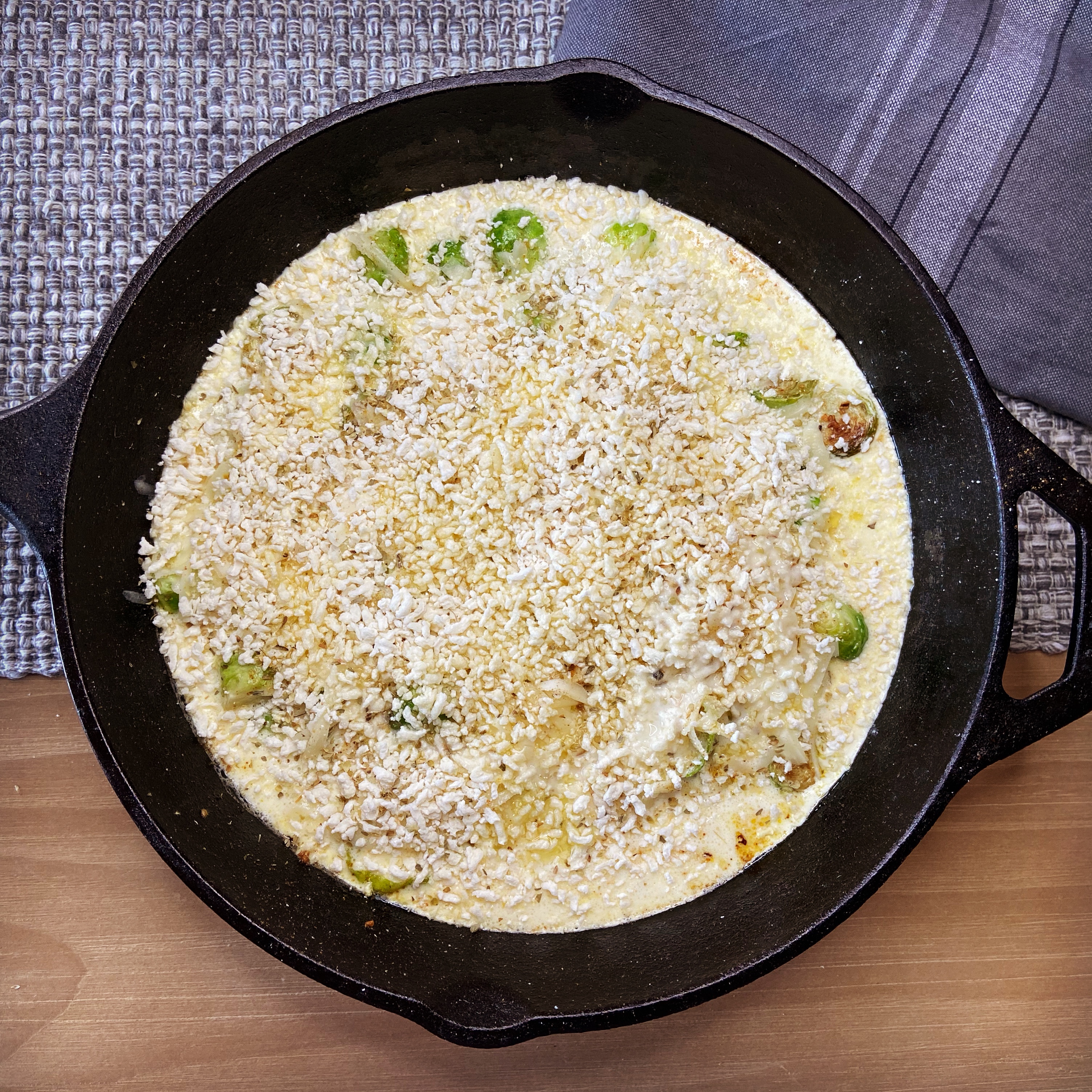 The second time I made this dish, I pan-roasted my sprouts and garlic in an 8-inch cast iron skillet–there was barely in free room in the skillet. I then removed the skillet from heat and added the cheese, cream, seasonings and breadcrumbs and herbs in that order (instead of mixing the cream and cheese together in a pot). Then I drizzled some additional butter on top of the breadcrumbs. In order to ensure you don’t overcook the Brussels sprouts, I would stick to baking them for 10 minutes only. I think the initial stage where you pan-fry them is most important in regard to how “done” the sprouts will be. If you fry them too long, they will turn out mushy when baked.