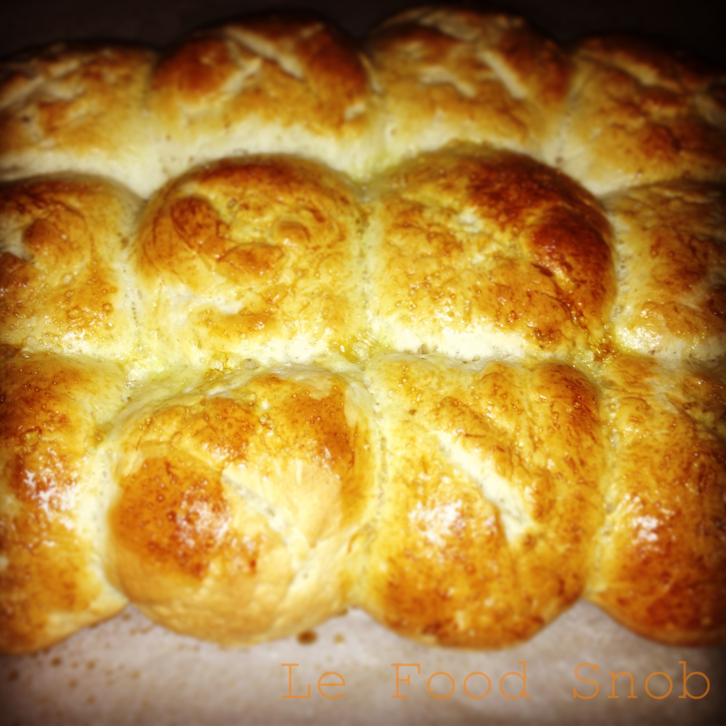 4. Form dough into equal sized balls (I made 12) and place on a baking sheet lined with parchment paper (I sprayed with cooking spray) so that the balls of dough are either touching or almost touching.  Allow to rise 60 to 90 minutes, or until doubled in size. (My house was cold, so I forced them to rise in a warmed oven.1