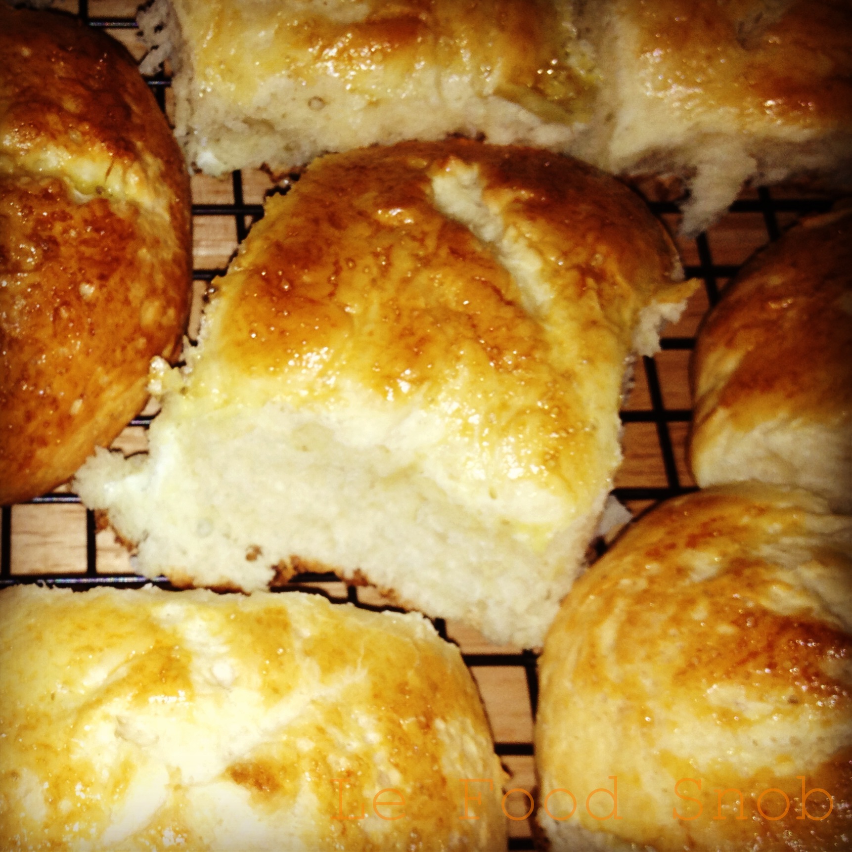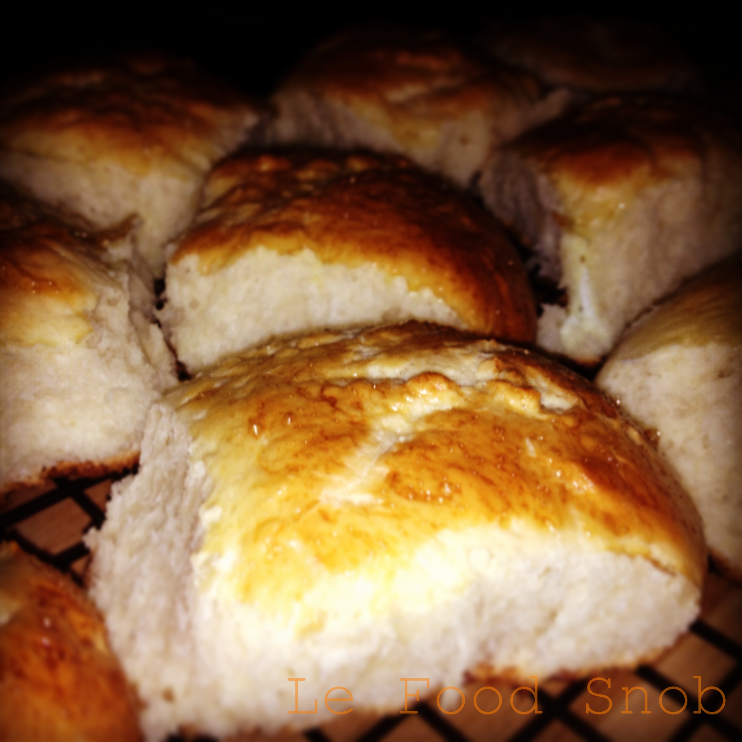 The original recipe suggests baking these in muffin tins. I did this for the whole wheat disasters. But for the second batch I rolled the dough out into 12 small balls and set them on a cookie sheet to rise. as these are the kind of rolls I grew up eating on Thanksgiving. Sadly, I cooked the second batch a bit longer than was necessary (trying to brown the tops), which resulted in a slightly burned bottom and dried out roll. Into the freezer these went for another day and another recipe!
