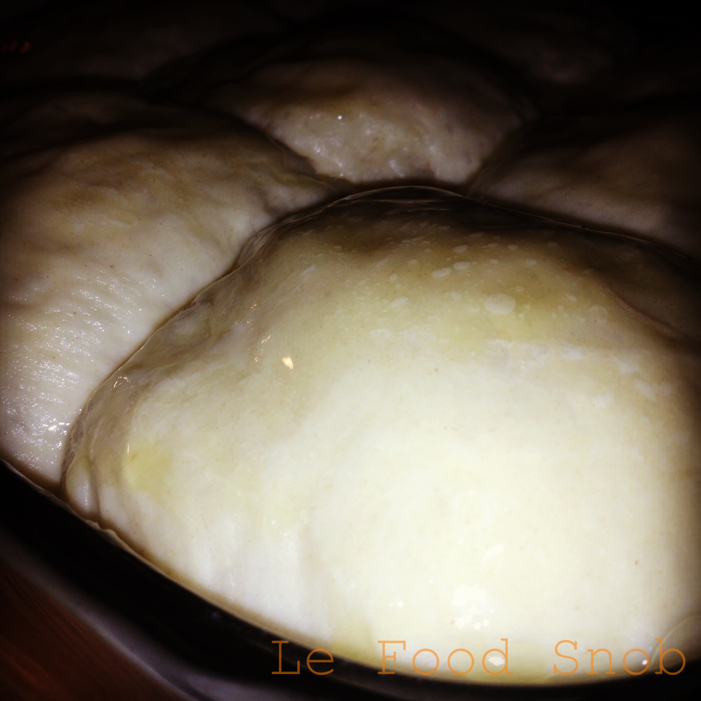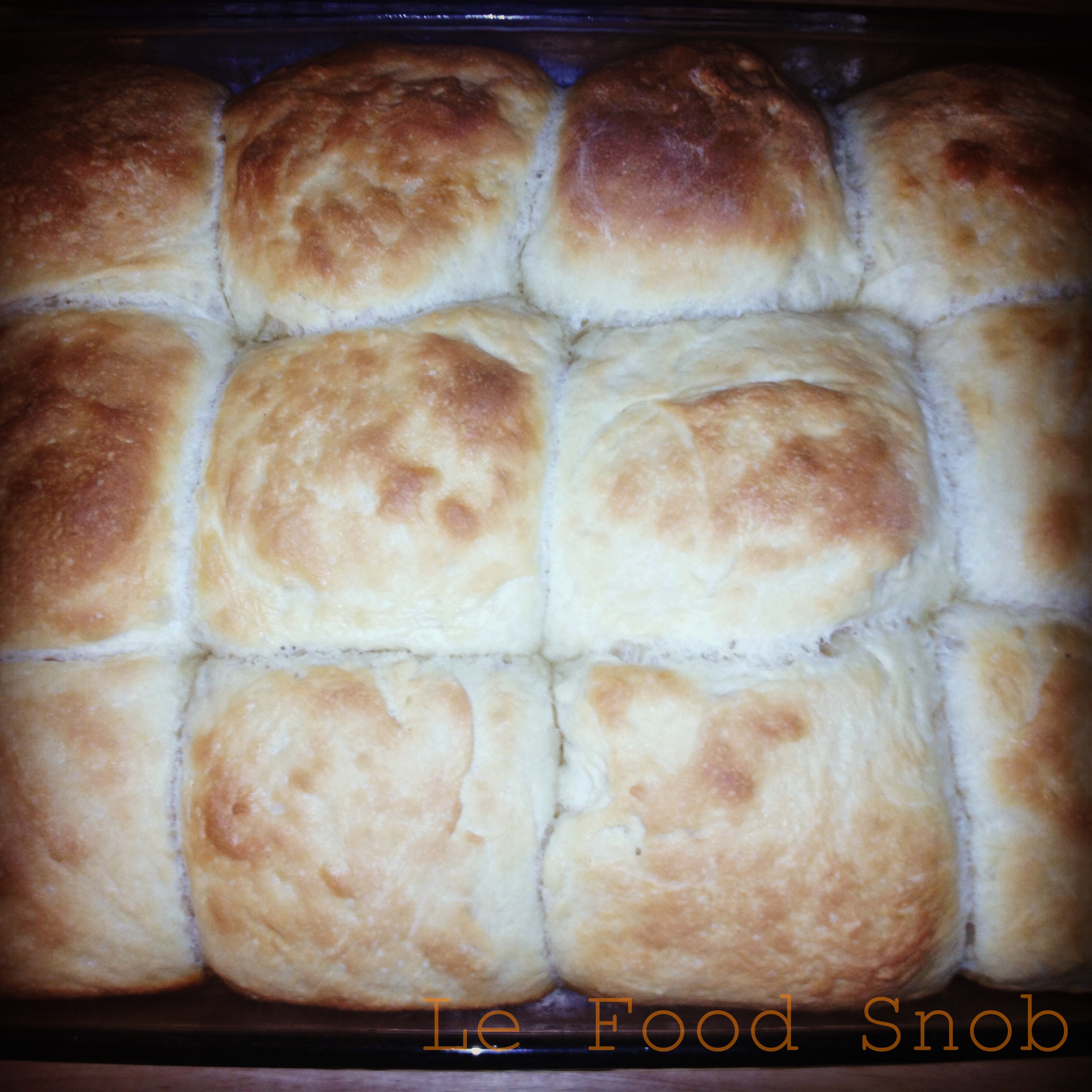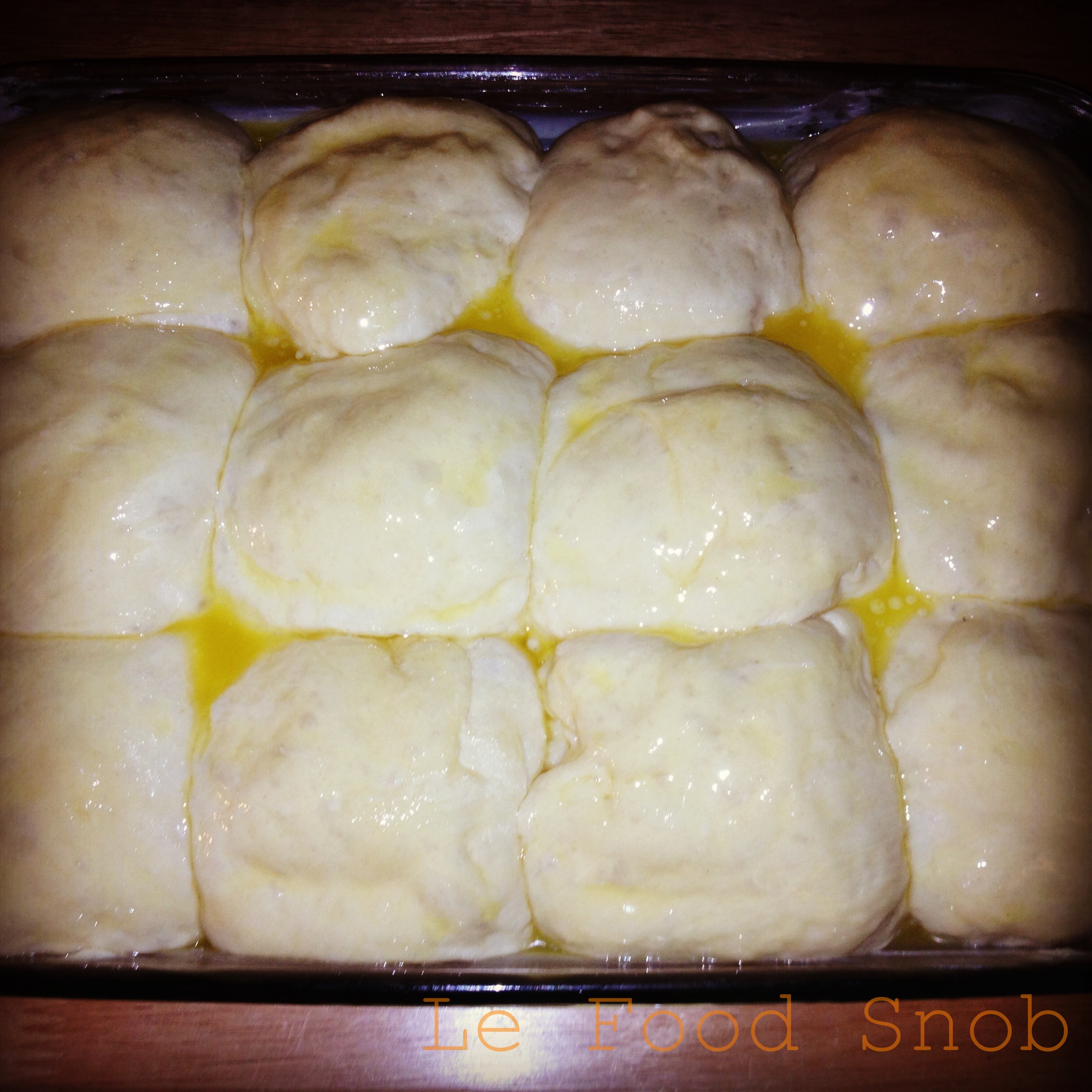 - Gently deflate the dough and then divide into 12 equal pieces. Using your hands, round each dough piece into a ball. Place the balls of dough, seam side-down, in three rows of 4 each. Cover with a kitchen towel and place in a warm spot until they’ve risen almost to the top of the baking dish, about 1 to 2 hours, depending on how warm your kitchen is from all that cooking.