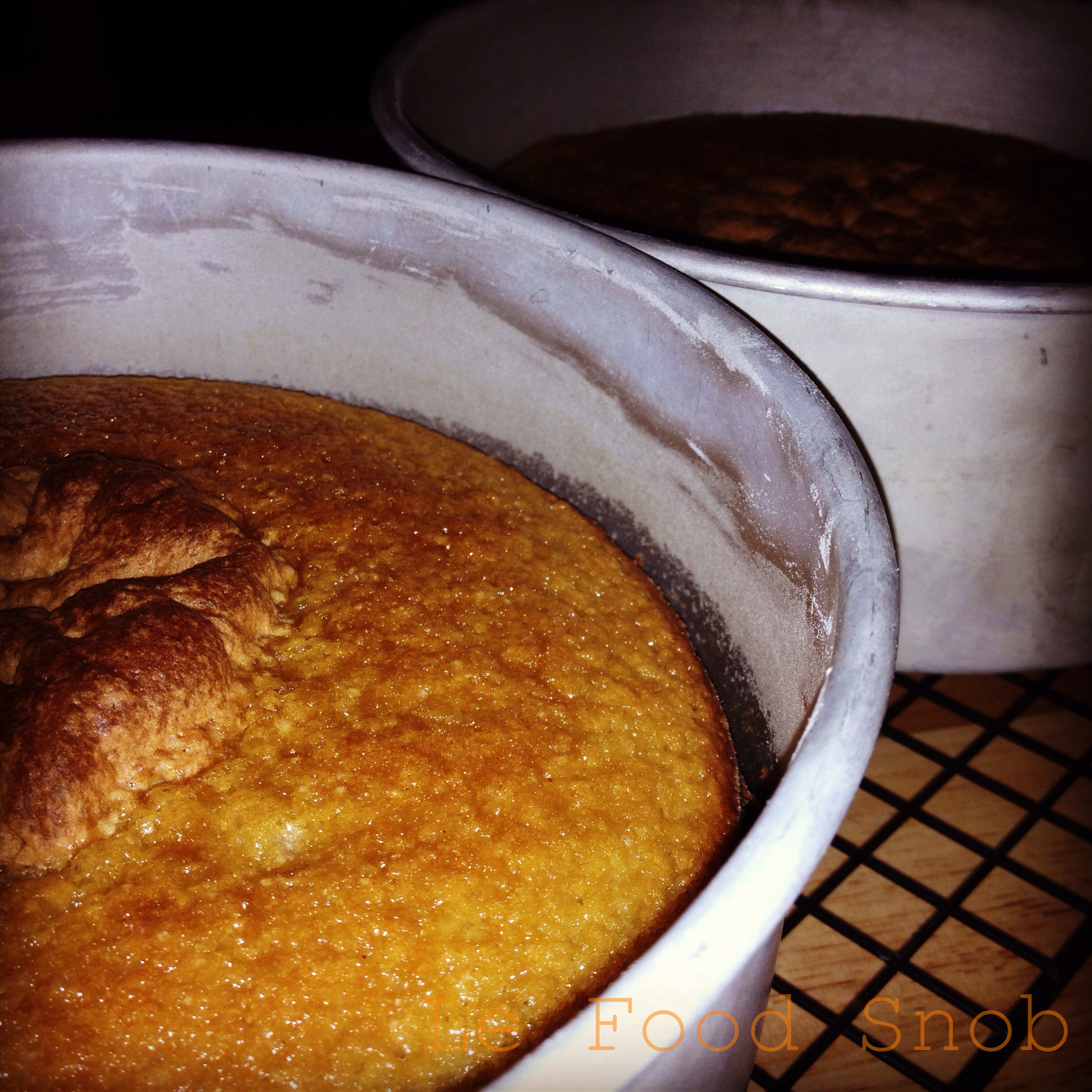4. Generously grease and flour two eight-inch layer pans. Divide the batter between the two pans. Bake until risen, golden brown and springy to the touch, about 40 to 50 minutes. Remove from oven, let cool 1 to 2 minutes and then turn out onto a cooling rack. While layers are cooling, prepare the frosting.