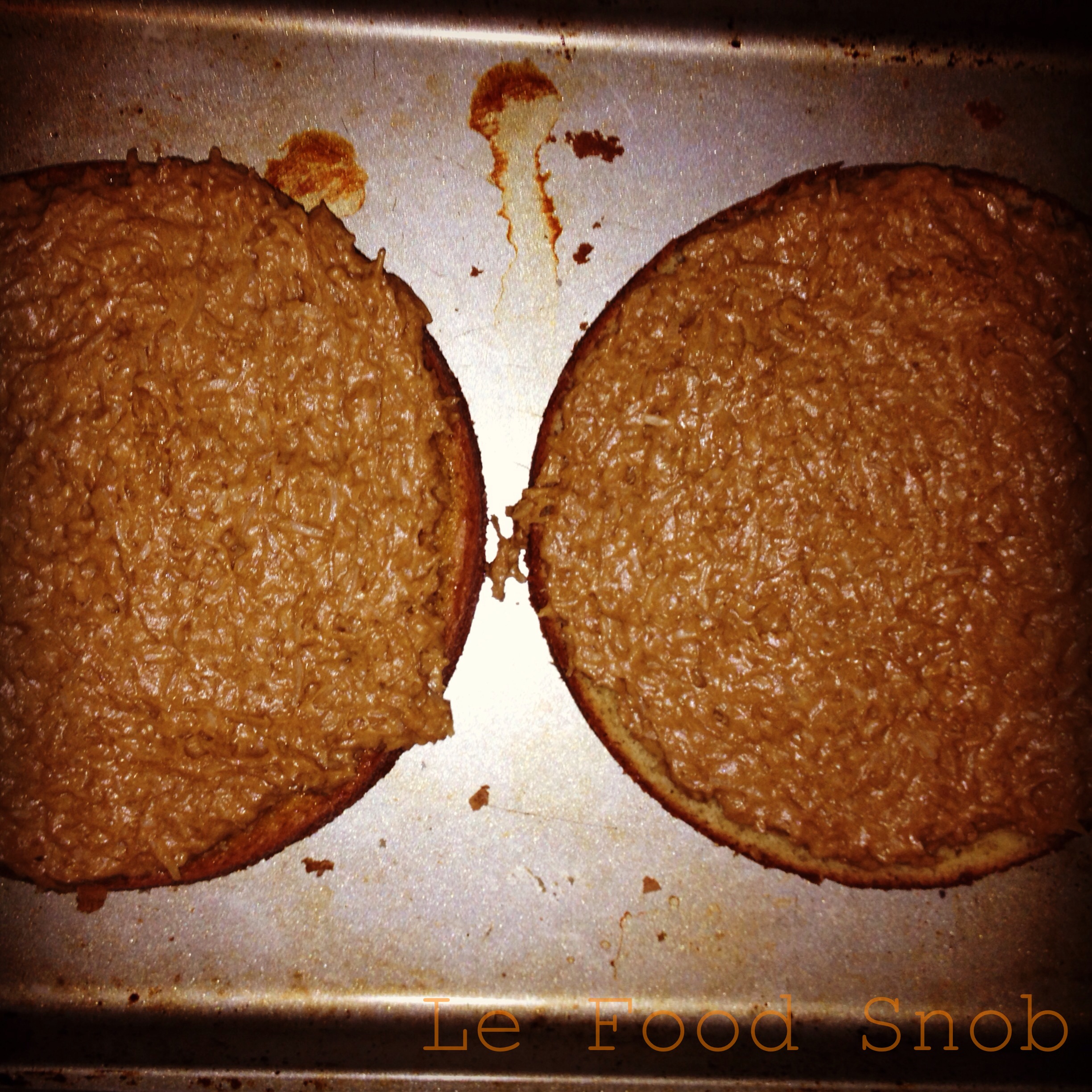 2. Preheat oven to broil, placing the oven rack low enough to accommodate the cake. Place the cake layers on baking pans and frost the tops. photo 2