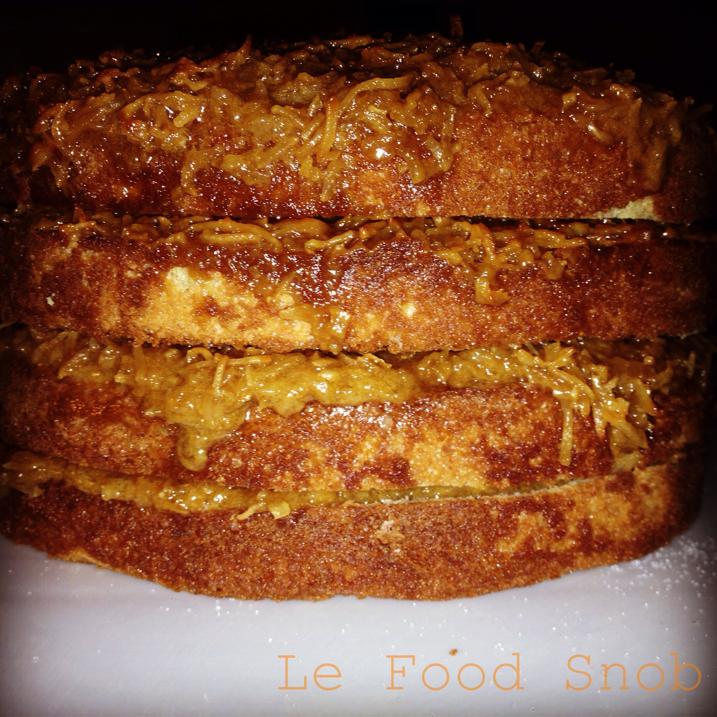 1. Melt the butter in a pan over medium-low heat until it bubbles and browns. Pour into the bowl of a stand mixer and beat with the brown sugar. Add the sour cream and salt and beat again. Once creamy, put the mixer on low and mix in the coconut flakes. Slice the cake layers in half using a serrated knife or other mechanism so that you have four equal layers.