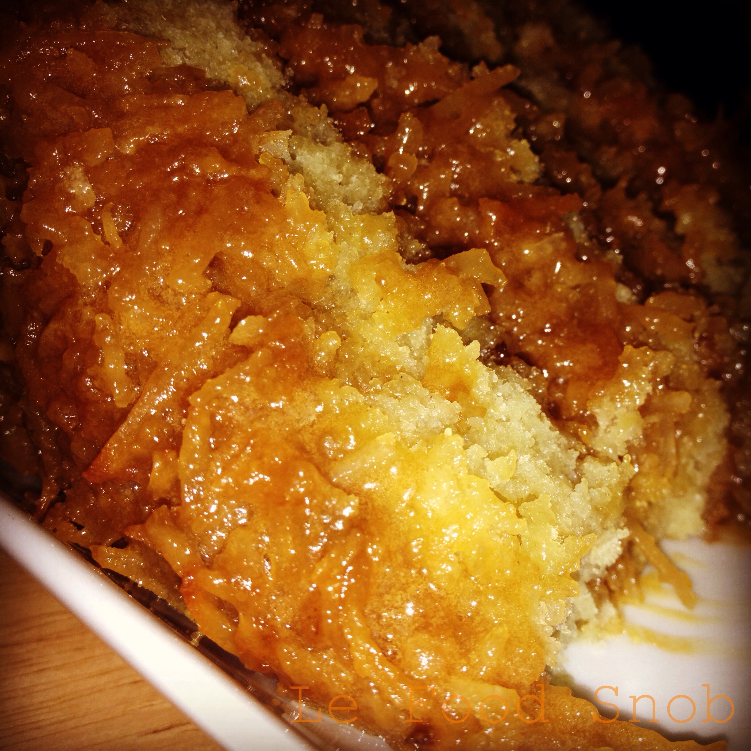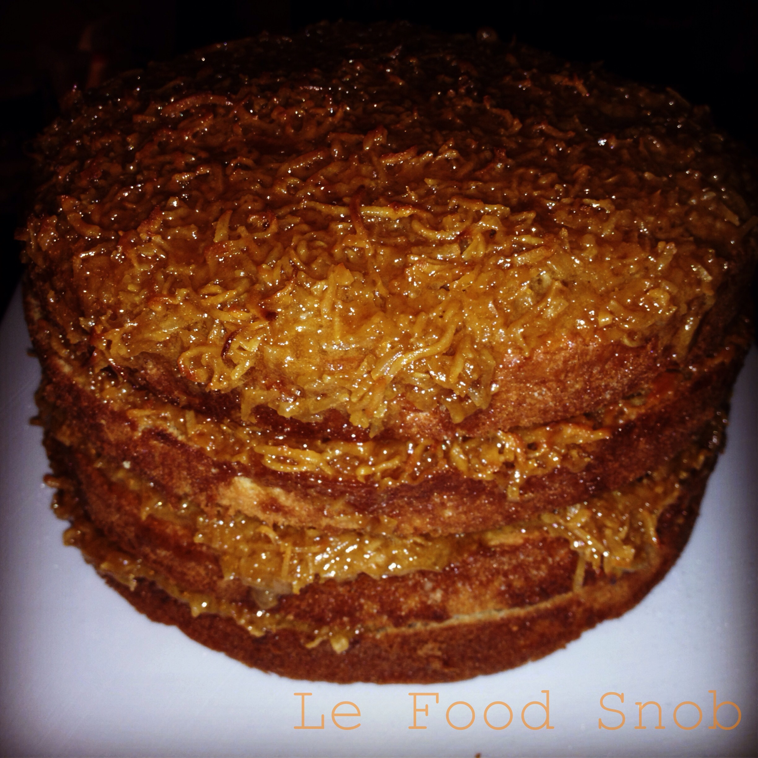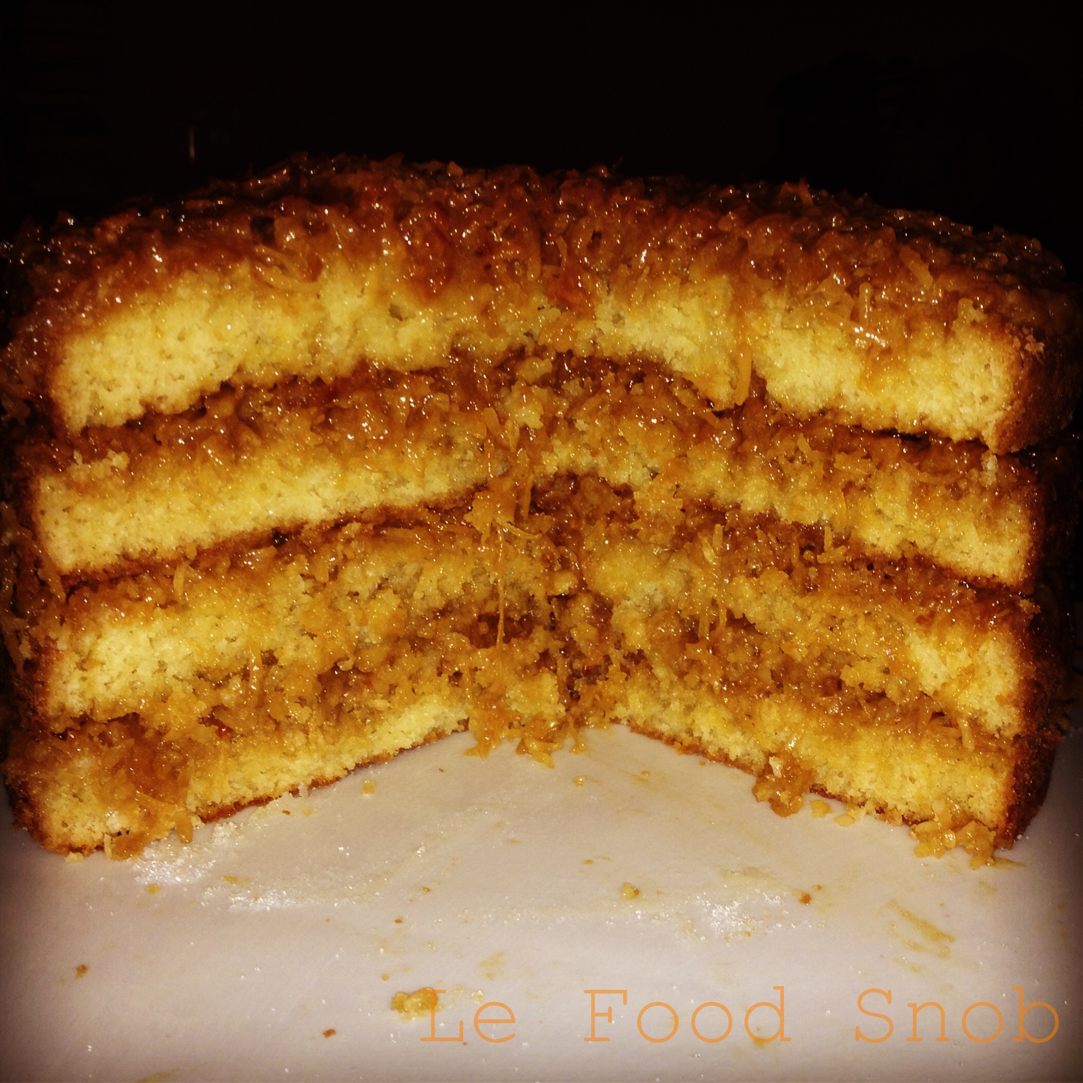 I baked the cake in two 8-inch round layer pans and cut the layers in half. Instead of frosting both the tops and sides of the layers, I decided to leave the sides unfrosted. It gave the cake the appearance of a German “vanilla” cake. Because I didn’t frost the sides, the layers of frosting were monstrously thick. The cake itself is moist. But the frosting contributes to the moistness. If you like coconut, you should try this cake.