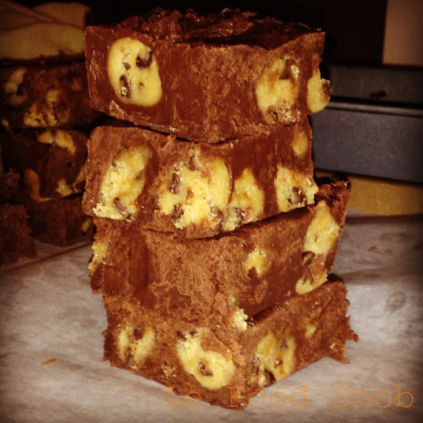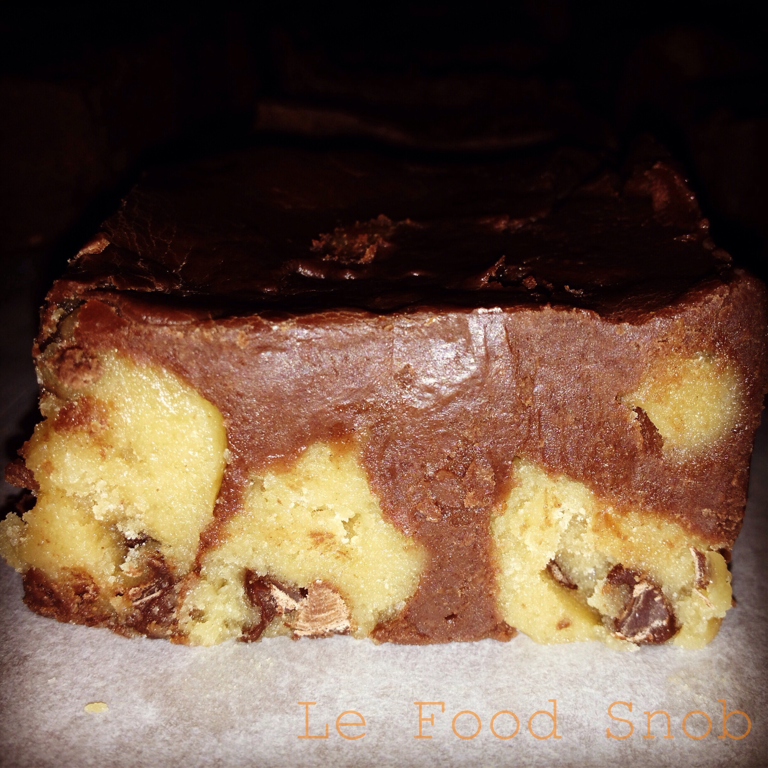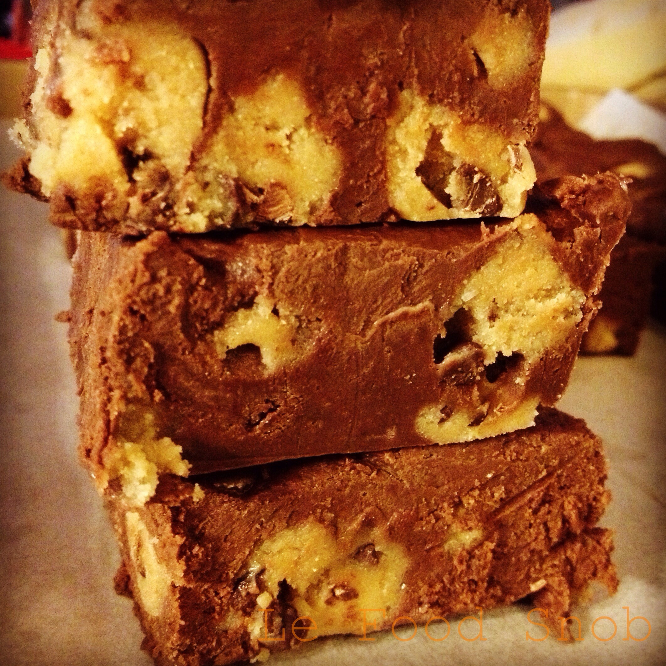 - When chocolate is melted remove from heat. Remove your cookie dough from the fridge and carefully fold into the fudge. Spread immediately in the pan. Chill for at least an hour before cutting into squares and serving.