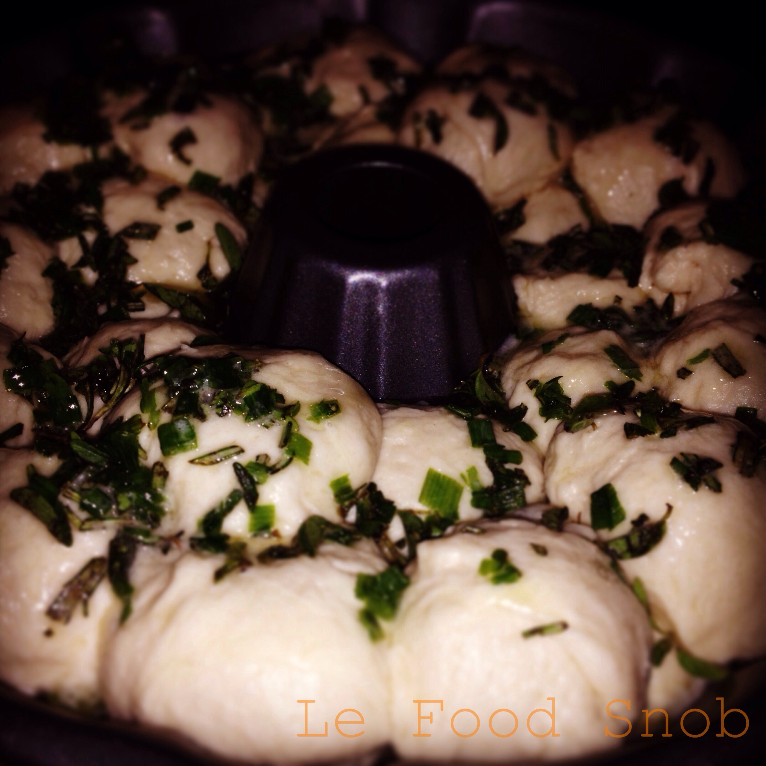 - Punch down dough and divide into 32 pieces. Grease a standard-size bundt pan with some of the melted butter. Sprinkle half the herb mixture on the bottom and sides of the pan.
