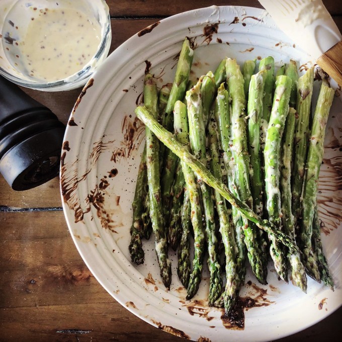 - Whisk together mayo, mustard, garlic, and lemon juice. Lay asparagus in single layer in baking dish. Brush on aioli.