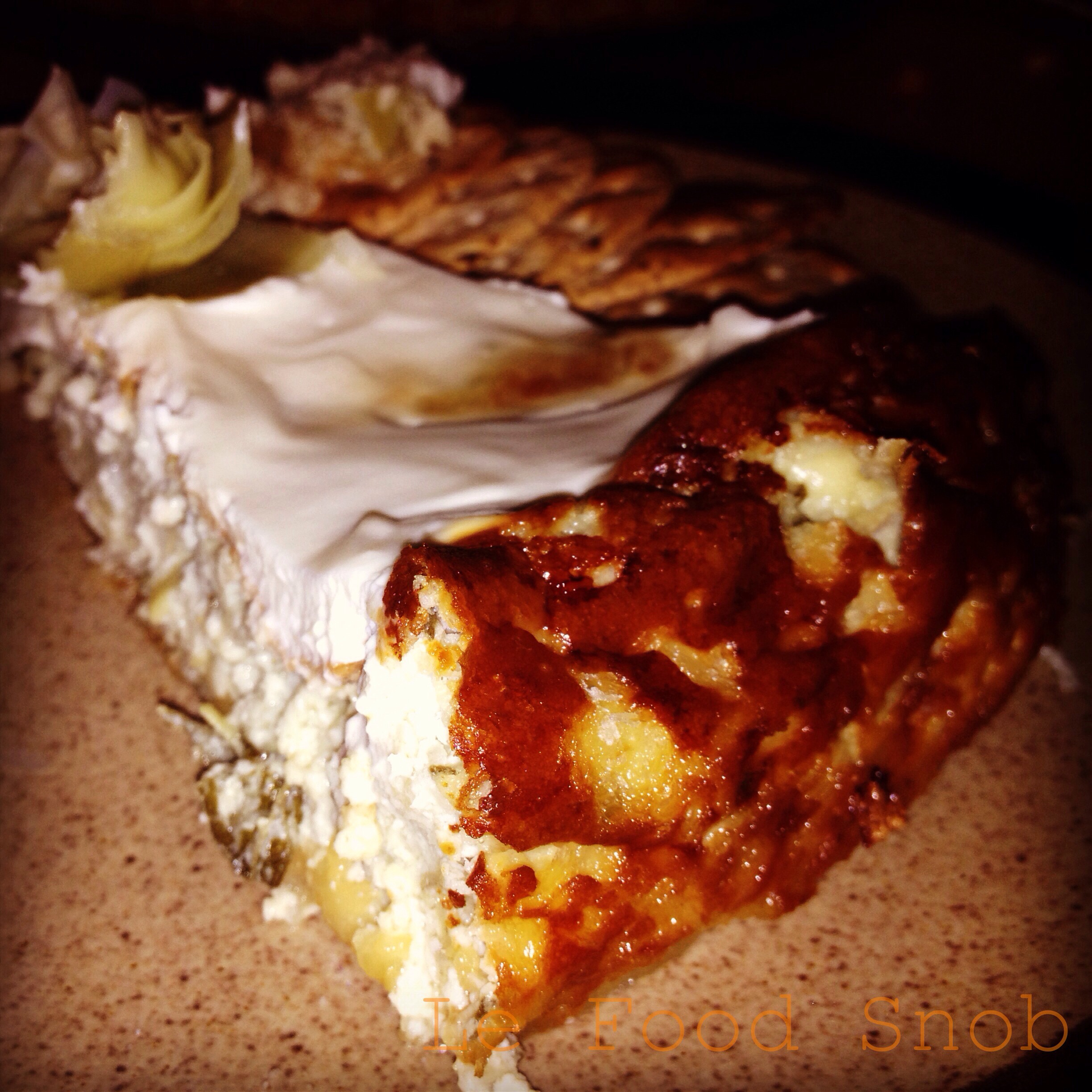 - Gently spread remaining sour cream over top being careful not to tear the top. Garnish with artichoke quarters. Bake 5 more minutes. Cool to room temperature on wire rack. Refrigerate several hours or overnight. To serve, place on serving plate. Carefully run knife around outer edges; remove sides of pan. Serve with mild-flavored crackers or crusty bread.