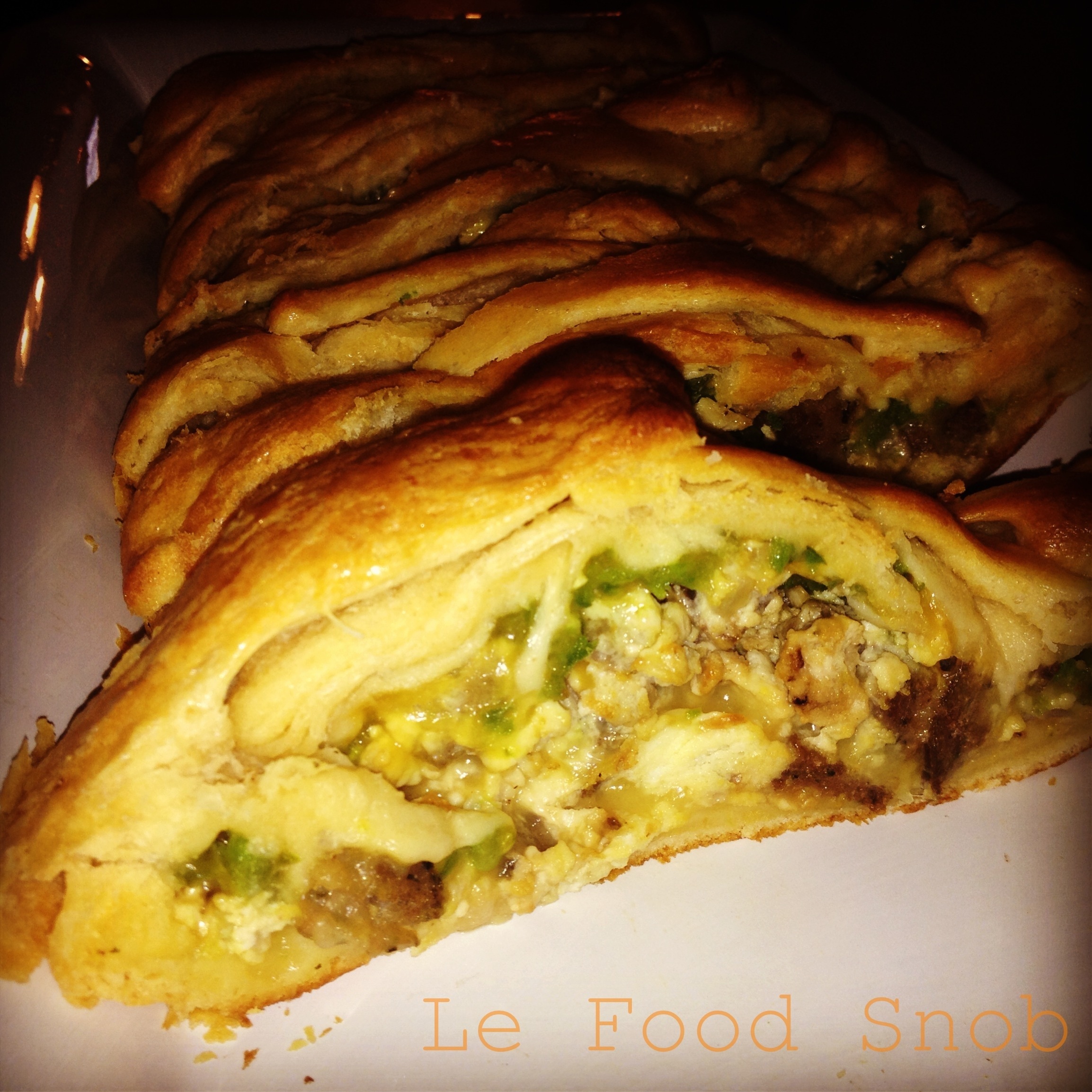 - Sprinkle Monterey Jack lengthwise down center of dough, leaving about a 2 1/2-inch border on each side. Spoon egg mixture evenly over cheese. Sprinkle cheddar over egg mixture; top with jalapeño peppers.