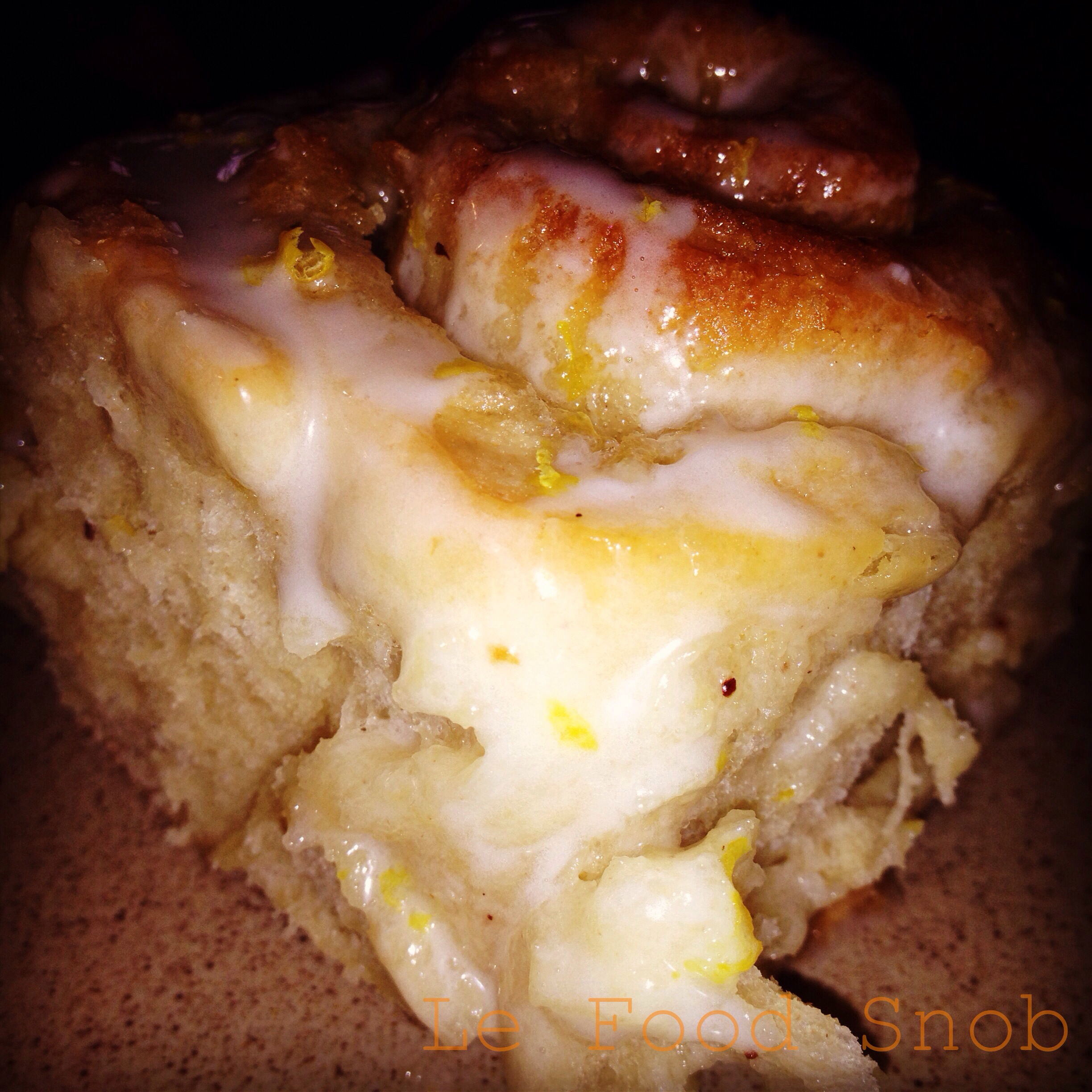 - While the rolls are baking, prepare the glaze. In a small food processor (or with a mixer, or a sturdy whisk), whip the cream cheese until light and fluffy. Add the remaining lemon juice and blend until well combined. Add the powdered sugar and blend until smooth and creamy.