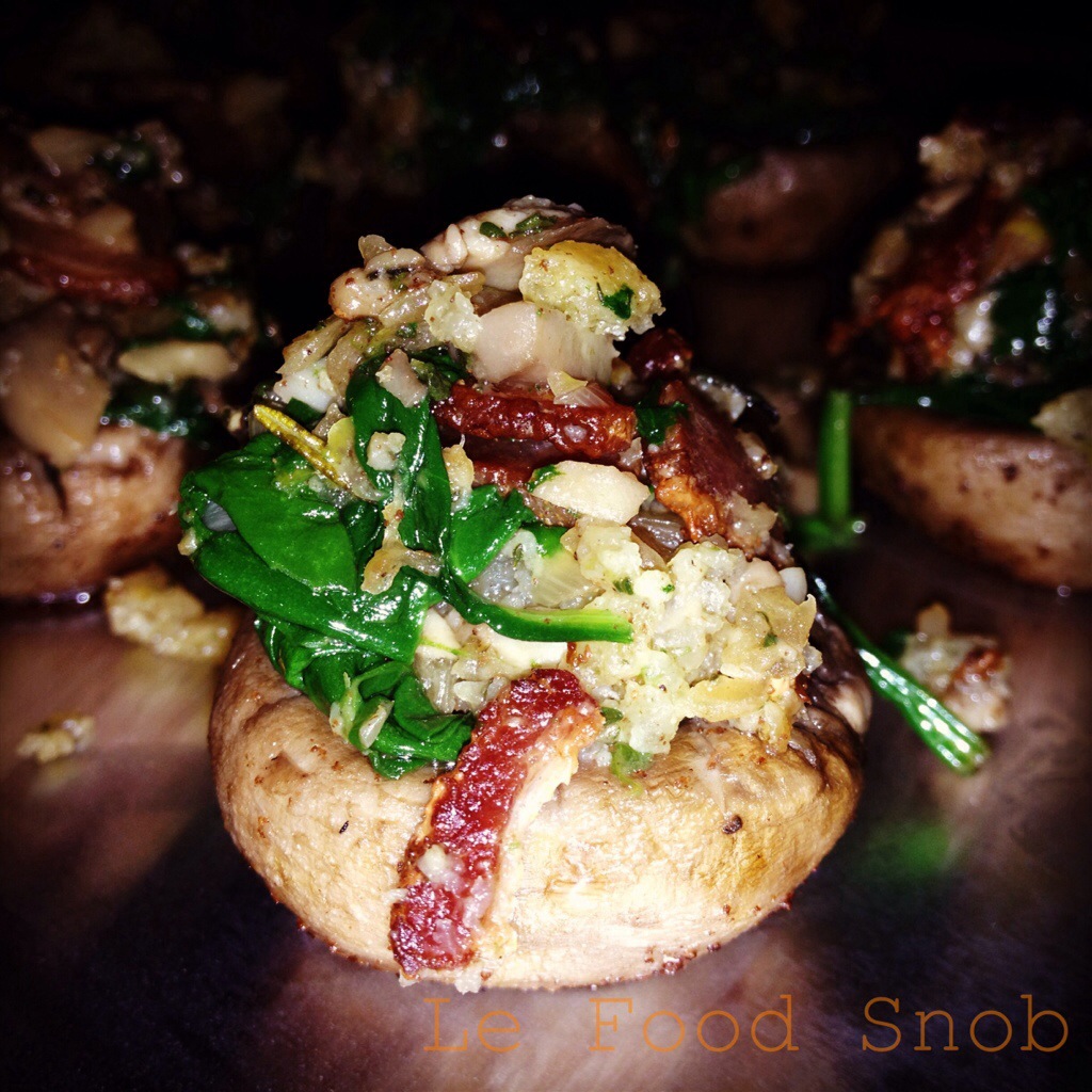 - Transfer mixture to a bowl and add the bread cubes and lemon zest. Chop the cooked bacon, and combine with the mushroom mixture. Place the caps stem side-up on a separate baking sheet and evenly fill each cap with the stuffing.