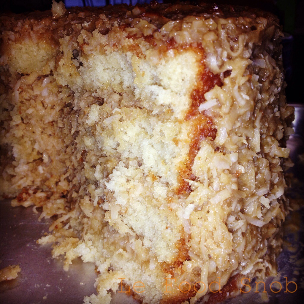 I baked the cake in two 8-inch round layer pans and cut the layers in half. Instead of frosting both the tops and sides of the layers, I decided to leave the sides unfrosted. It gave the cake the appearance of a German “vanilla” cake. Because I didn’t frost the sides, the layers of frosting were monstrously thick. The cake itself is moist. But the frosting contributes to the moistness. If you like coconut, you should try this cake.