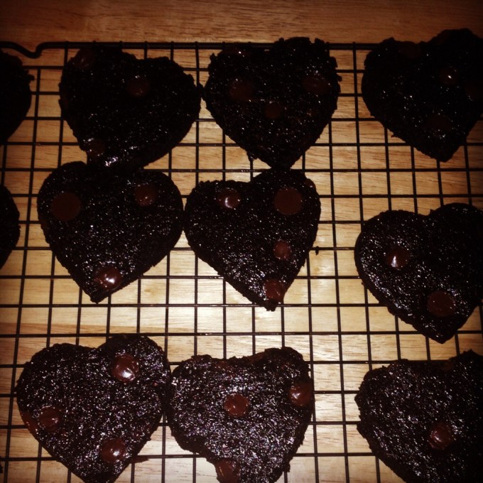 I whipped up an un-frosted double batch version of these brownies tonight using half black onyx cocoa (half regular) and cake flour. Then I took a heart-shaped cookie cutter to them and went at it. Cute, right? Aww.