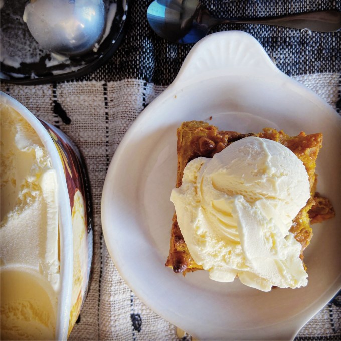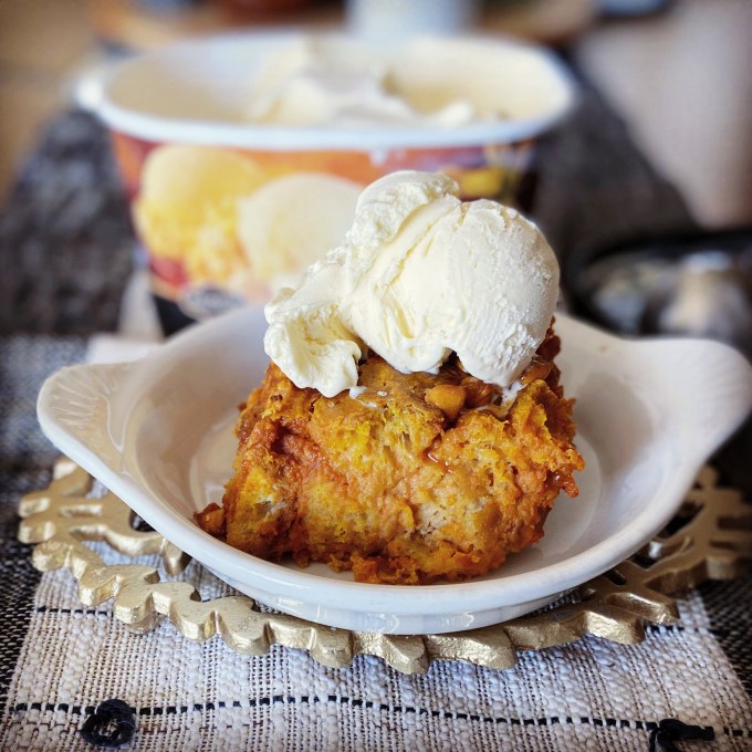 While the bread pudding is good on its own, it’s outstanding with Salted Caramel Ice Cream, which is what I topped it with. I would highly recommend topping your bread pudding with some flavor of ice cream or a dessert-like topping: like a bourbon sauce or something similar.
