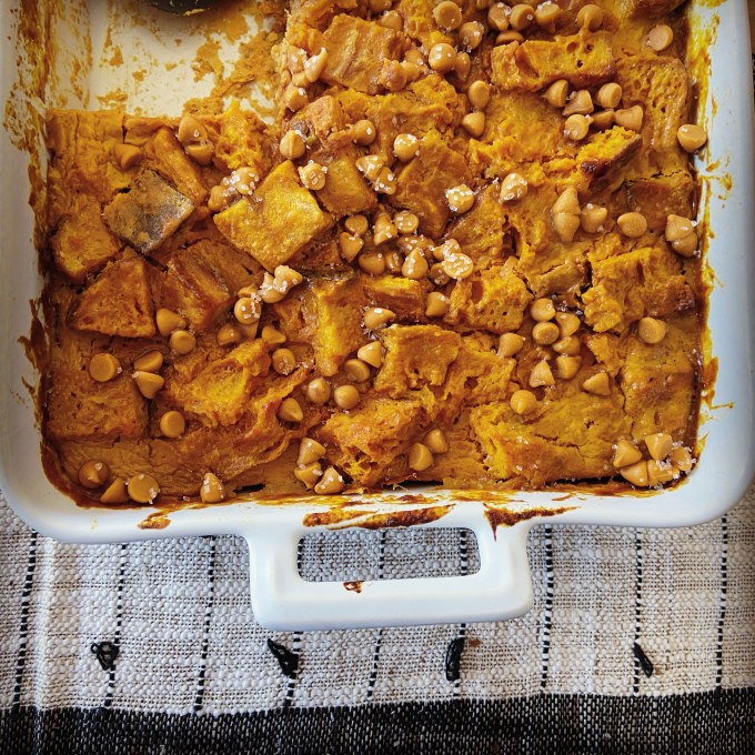 - Preheat your oven to 350 degrees. Sprinkle the mixture with butterscotch chips and bake for 45 to 55 minutes or until a knife inserted in the center comes out clean. Cool on a wire rack for 30 minutes to allow the pudding time to set. Serve warm with ice cream.