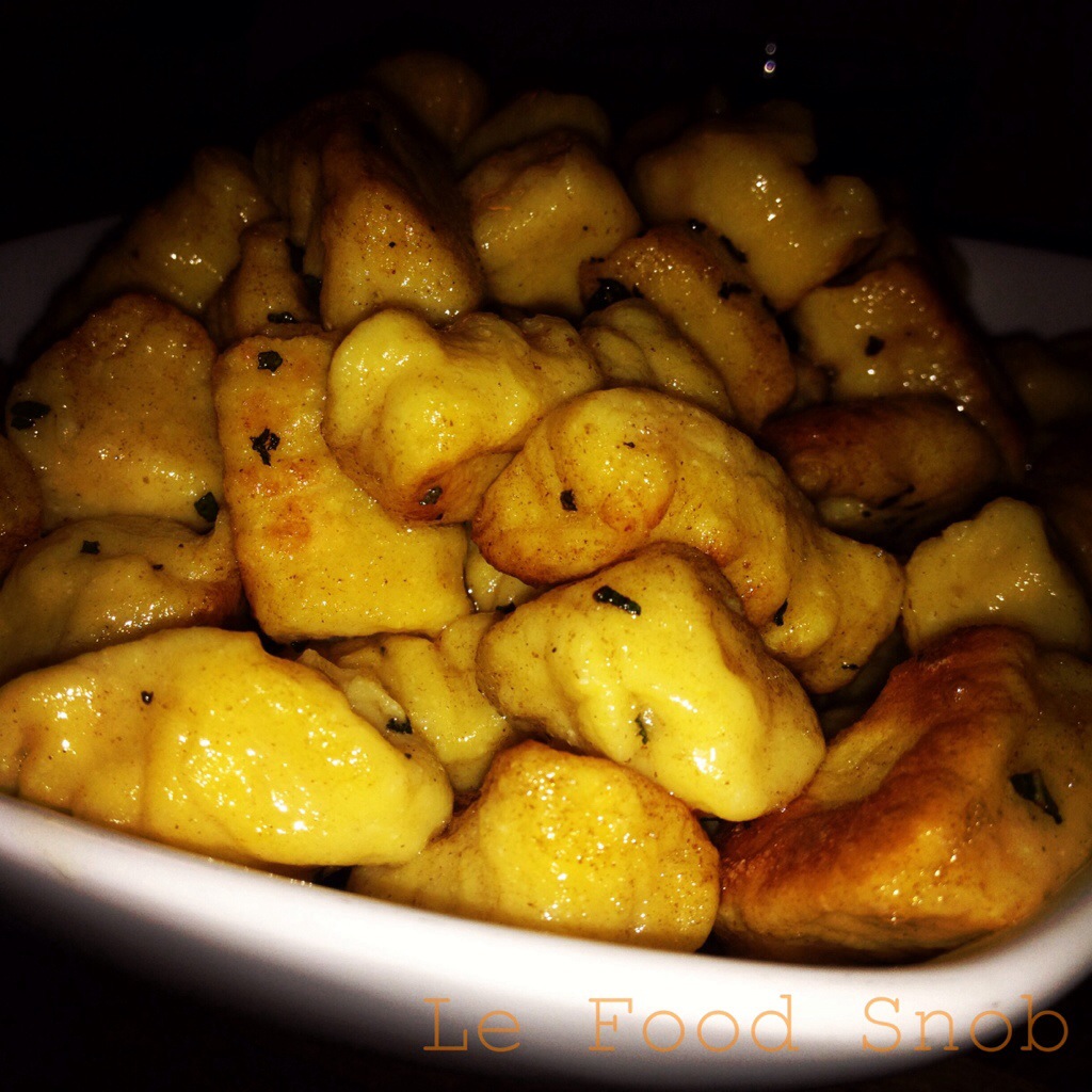 - When all the gnocchi are made, heat the butter over medium-high heat until it stops frothing. Add enough gnocchi to the pan to cover it in one layer. Fry undisturbed for 90 seconds. Sprinkle half the sage over the pan. Cook for another minute, then turn out onto plates. Repeat with the remaining gnocchi.