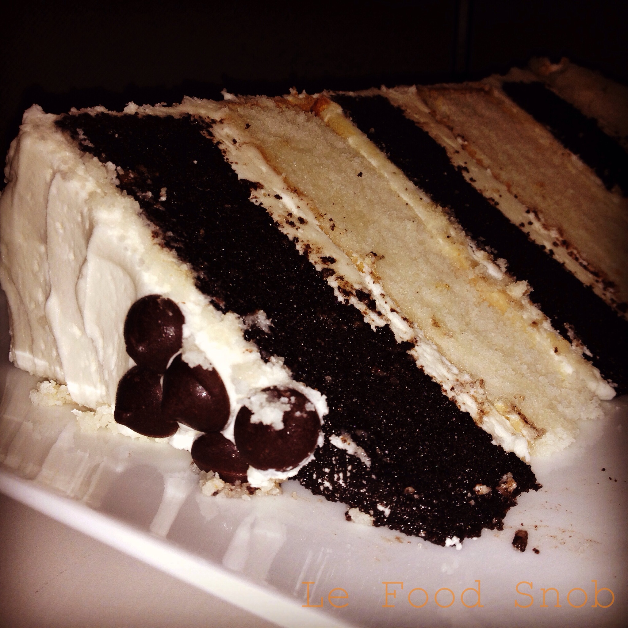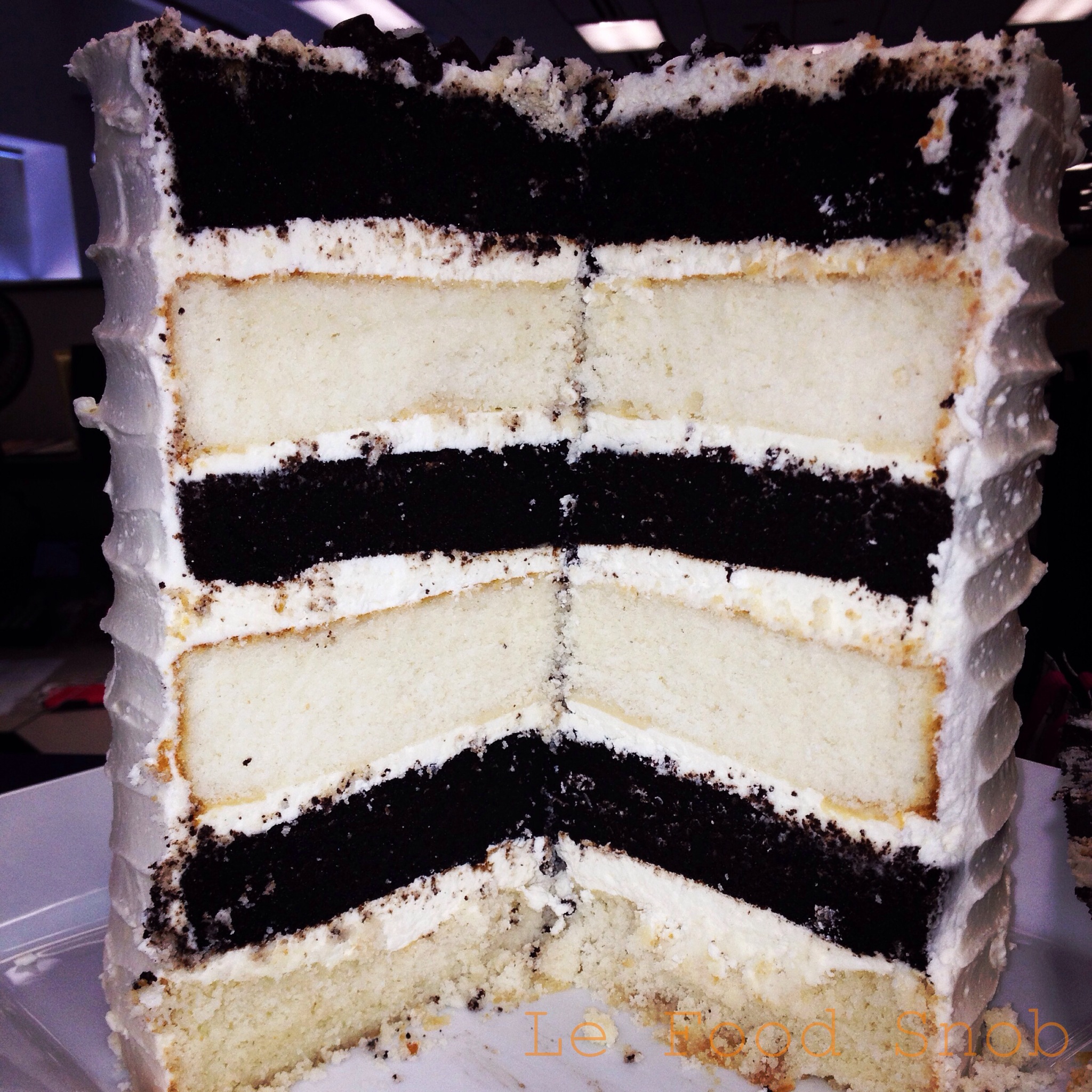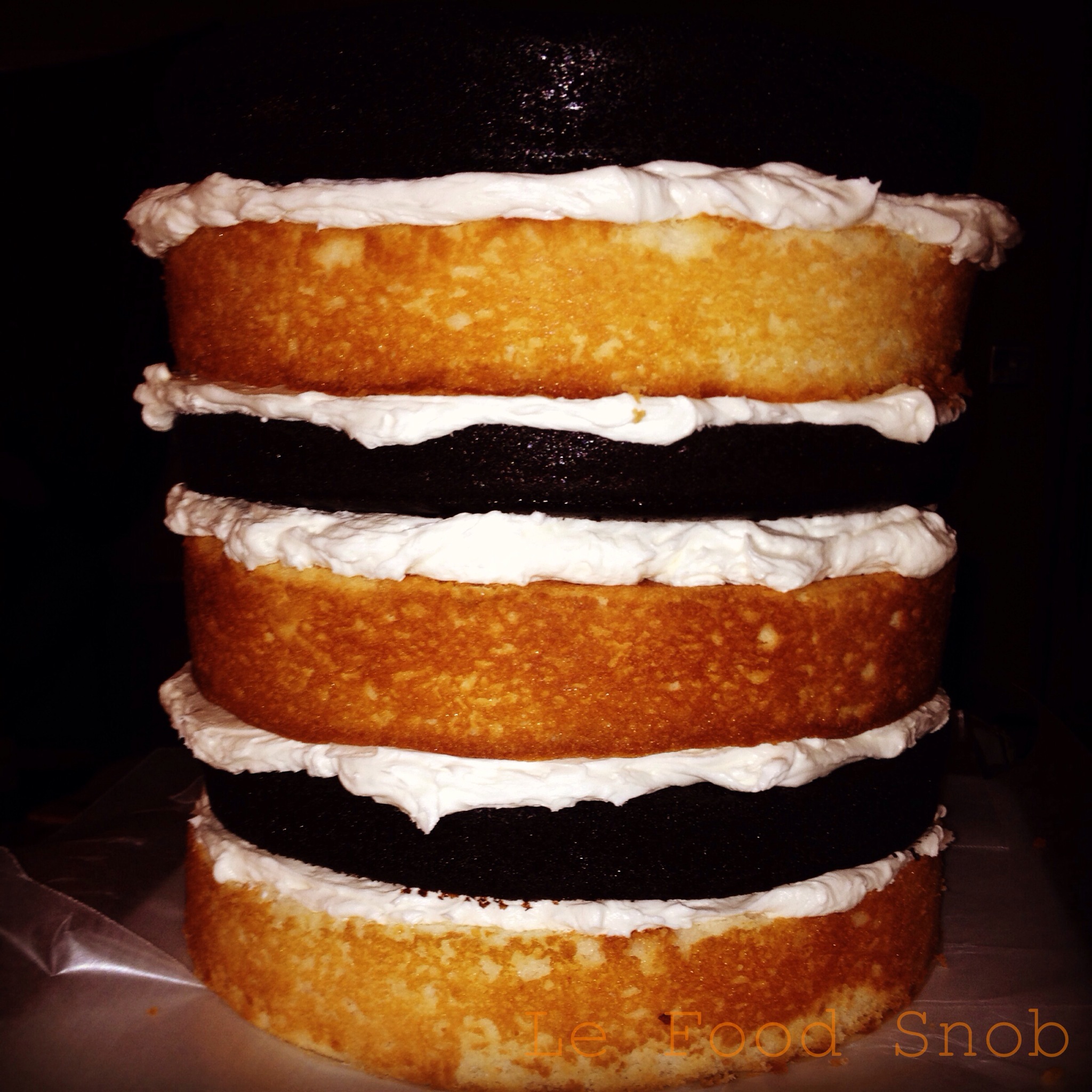 This was an interesting cake to make in that I pulled it together using cakes from two different websites, which didn’t exactly yield even cakes (the vanilla layers turned out way thicker). Despite that, my coworkers said this was the most fantastical cake I’ve ever made. The resounding consensus was that it would be perfect for a wedding. For the chocolate cake I used the recipe found on the back of the Hershey’s cocoa container. For the white cake, I looked to Whisk Together.