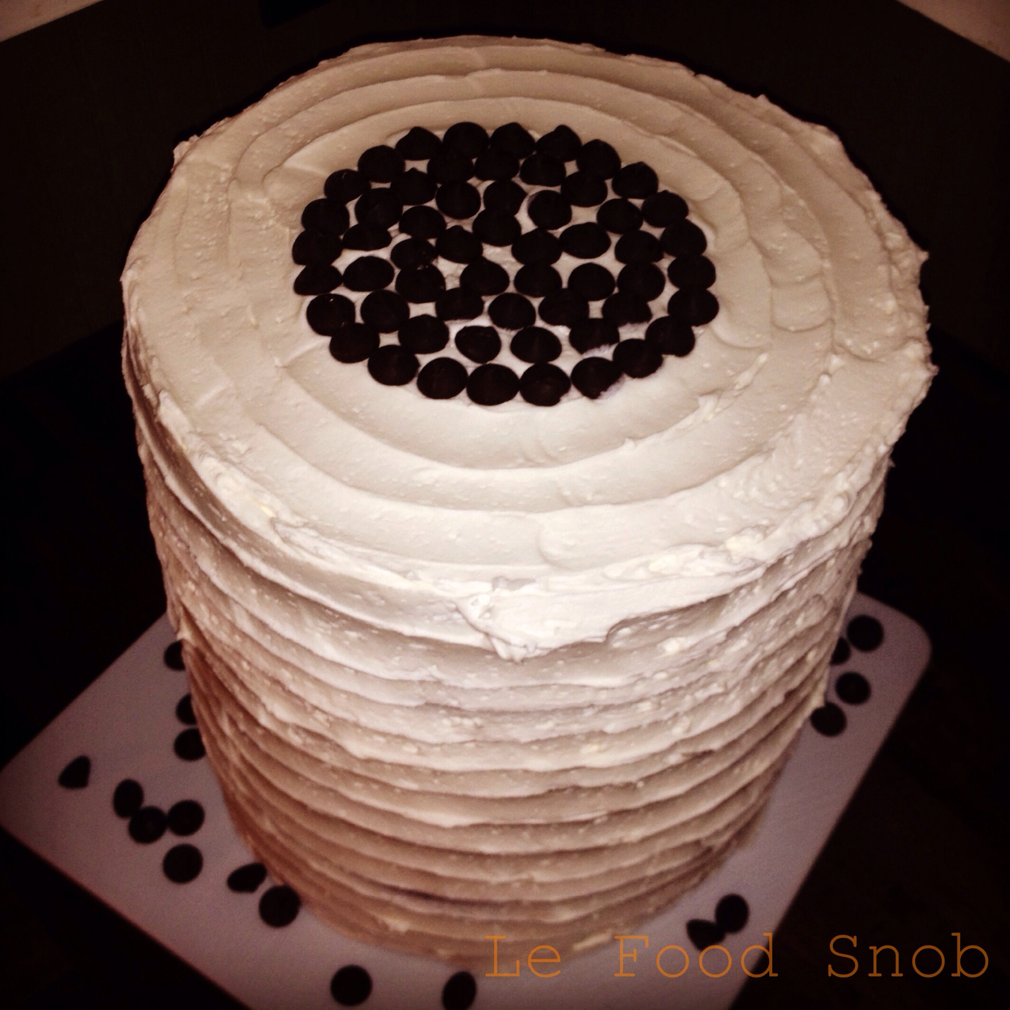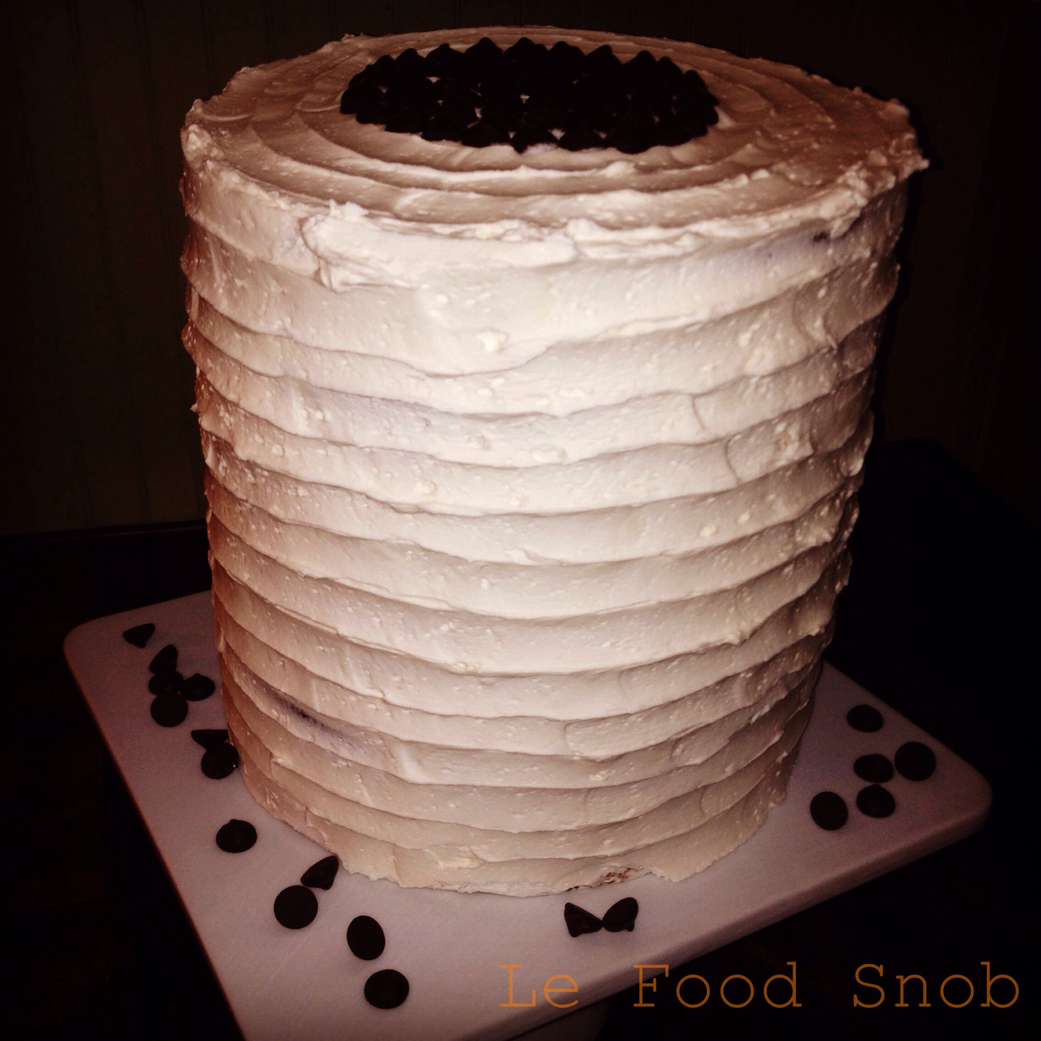 Frost the cake layers, top and outside with the frosting. I garnished my cake with bittersweet chocolate chips. This was the TALLEST cake I’ve ever made.