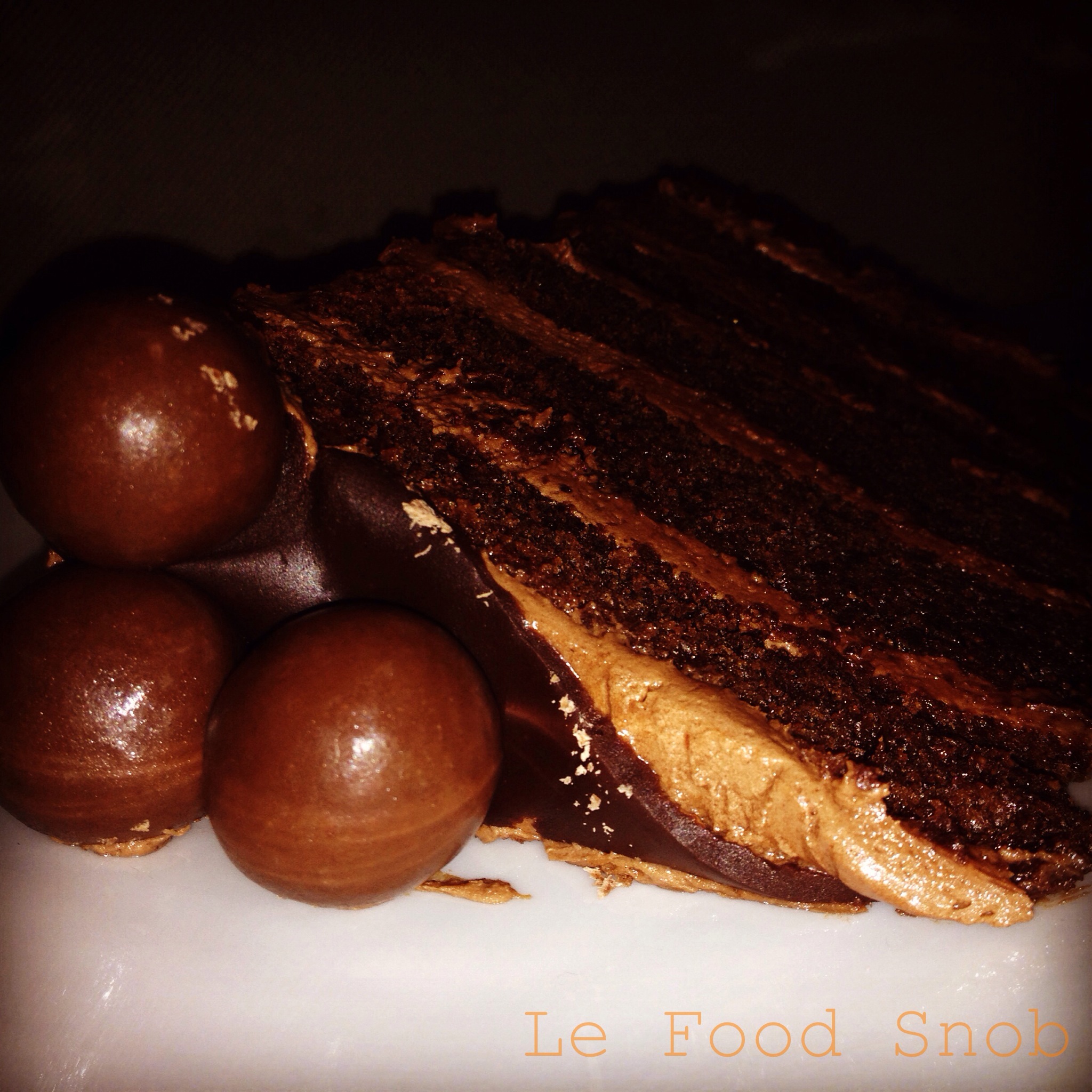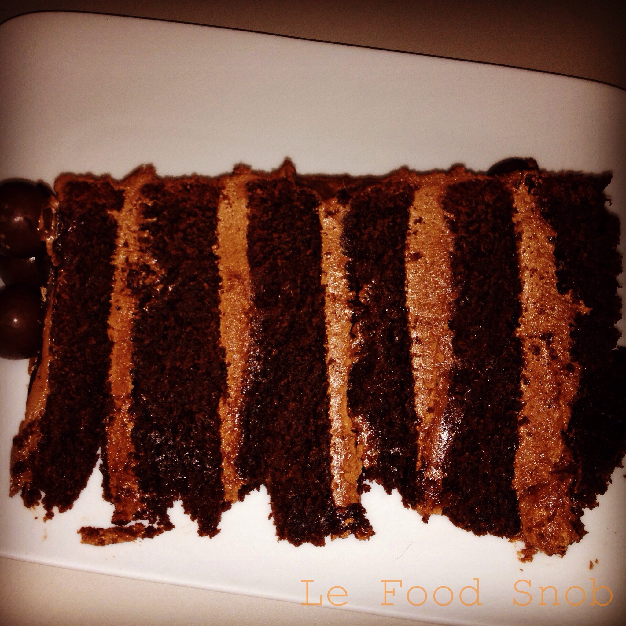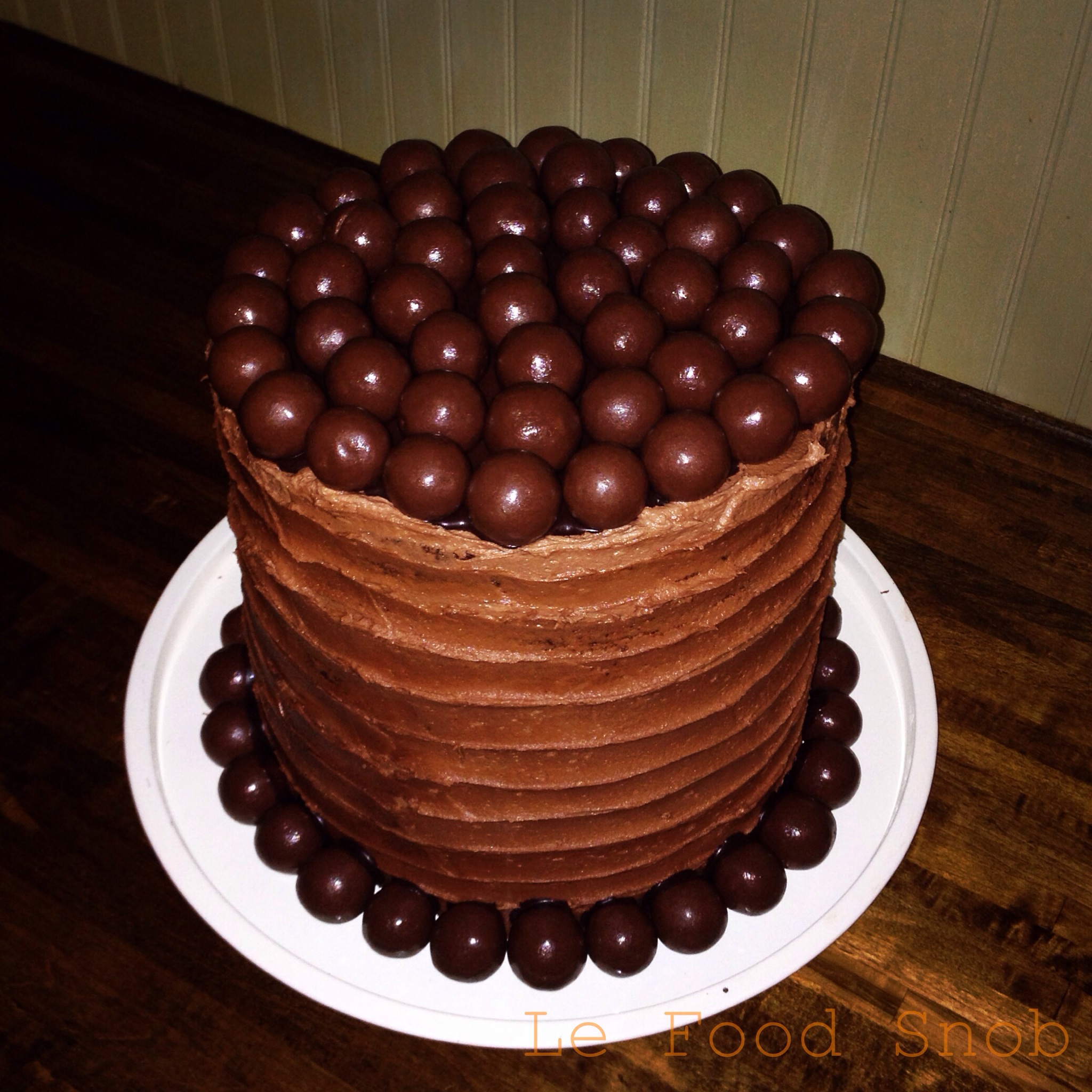 - To assemble the cake, split the cake layers in half. Frost the layers, top and outside with the chocolate frosting. Pour the ganache just on the top of the cake. Garnish with malted milk balls (the big kind you buy in the bulk section of your local grocery store).