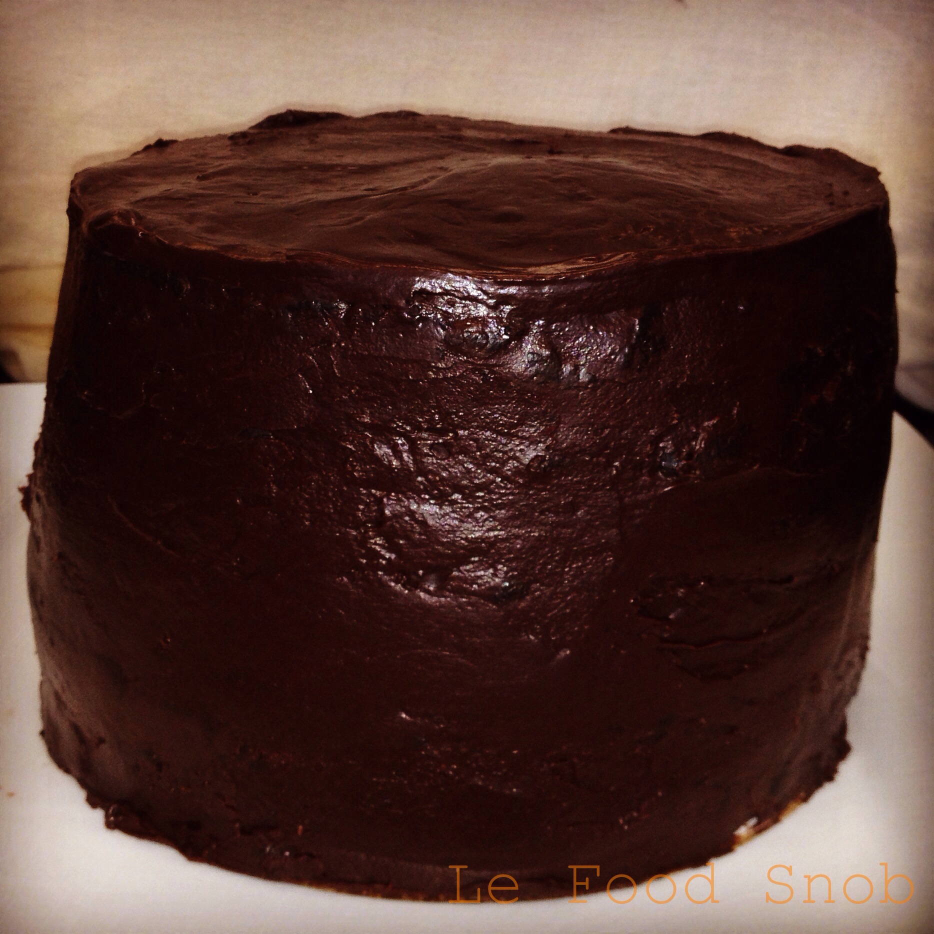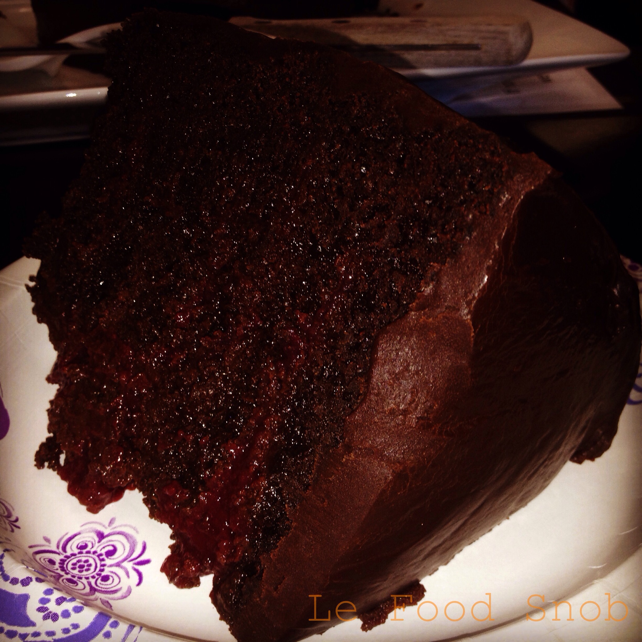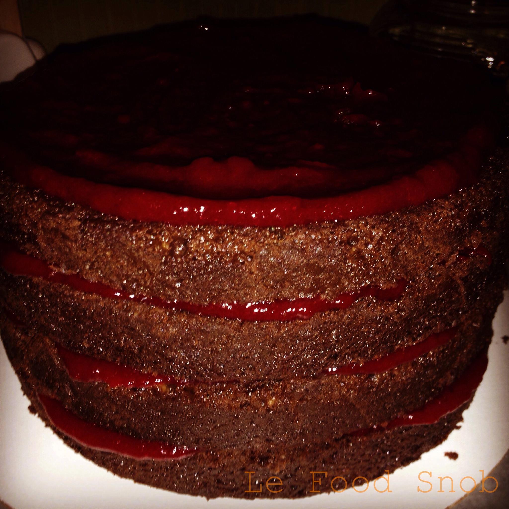 Her desired flavor? Chocolate raspberry, of which I’ve never really been a fan and quite honestly never attempted to make. I found this cake recipe at the picky cook’s website (I feel akin to her blog name) and decided to test it out on my coworkers prior to Anchal’s husband’s big day. I’m glad I did! I had a small snafu after doubling the recipe (don’t do this in a standard Kitchenaid mixer–it barely fits!). The cake spilled all over my oven while baking. A week later and my kitchen still smelled burnt. Even still, the cake turned out fantastic (if not slightly under-baked–which just makes your cake more moist, right?).