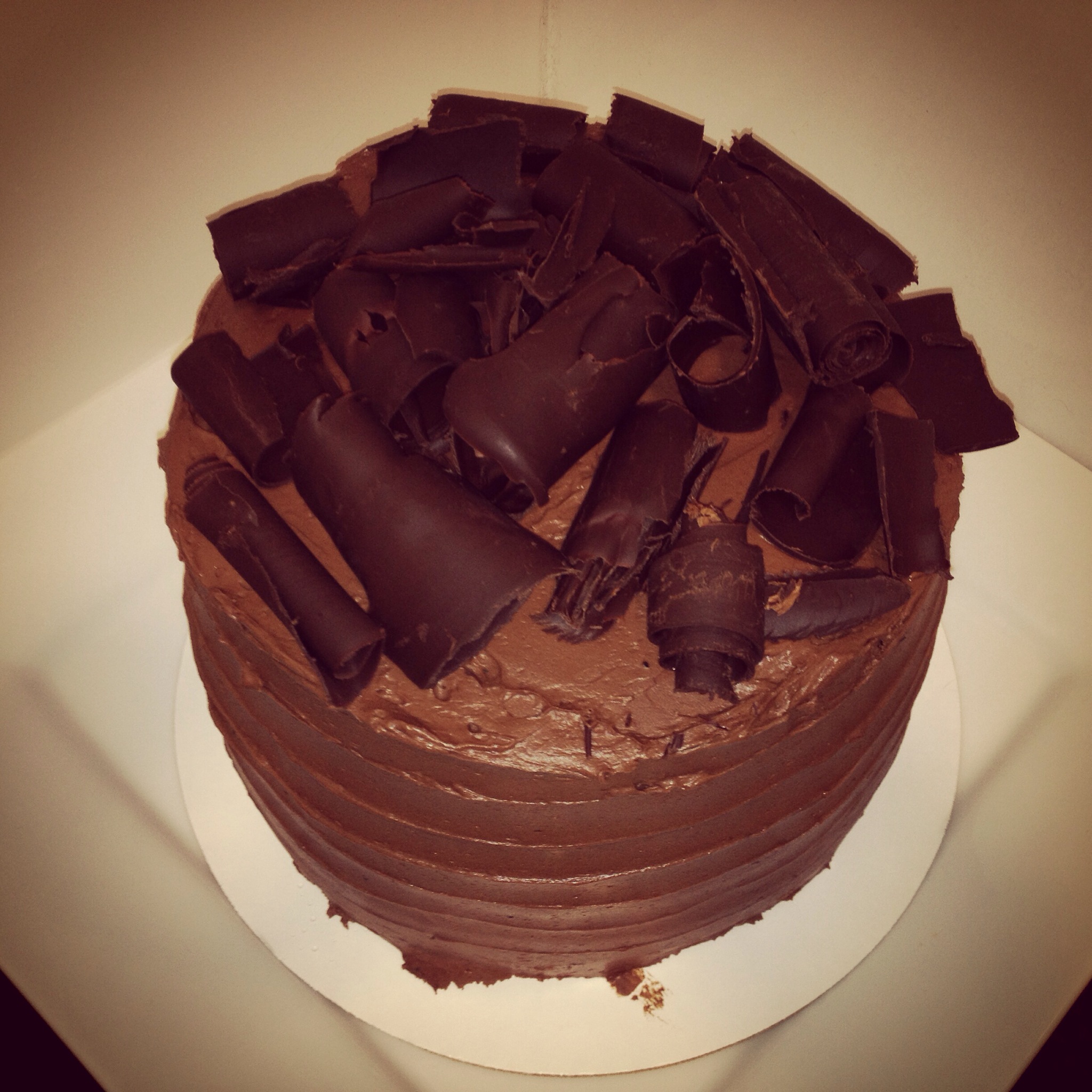 - Assemble your cake by placing one round onto your serving platter. Spread the mousse to form an even layer on top of the cake. Repeat with remaining layers and then frost the sides and top. Use your cake decorating genius to decorate the cake. I like to make a swirl around the entire cake. If I’m really trying to impress people I’ll pipe designs using a pastry bag. Place the cake in the refrigerator to keep cool and prepare any garnishes you’re using. I made chocolate curls for garnish using the Pioneer Woman’s method.