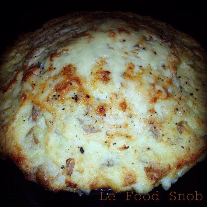 - I mounded the entire two pounds of potatoes (minus a few forkfuls that I had to taste) onto the pie dish, doming the potatoes like it was a big dome of whipped cream on a pie. Then I sprinkled it with Asiago cheese. A big sprinkling. OK I doused the dome of mashed potatoes with Asiago cheese.