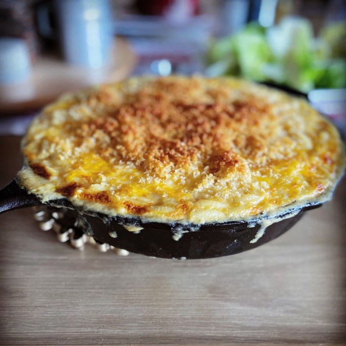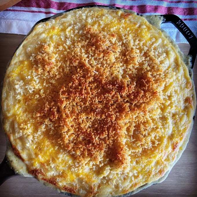 When I put it in the oven I was afraid that the creamy sauce was going to dry up. Twenty minutes later and after a short stint under the broiler to brown the breadcrumbs, the creamiest Mac and Cheese I’ve ever made was born. It should be noted that my dad said it was the best Mac and Cheese I’ve ever made. And he’s tried a lot!