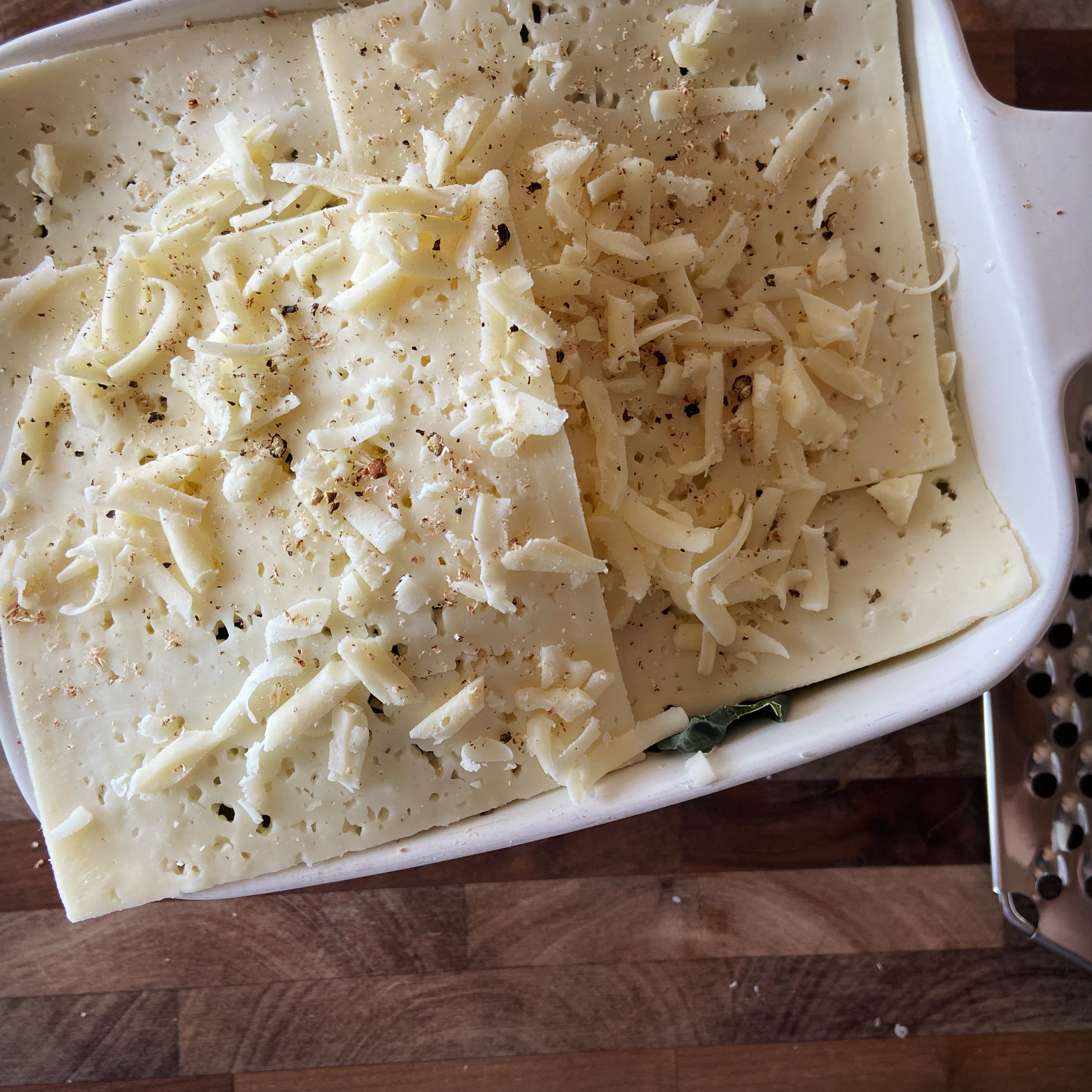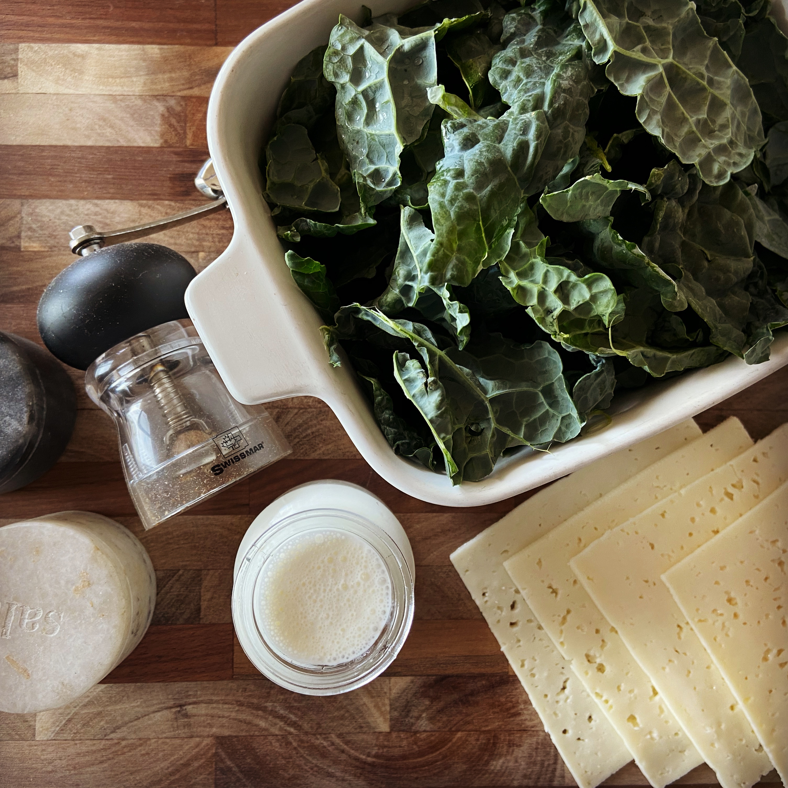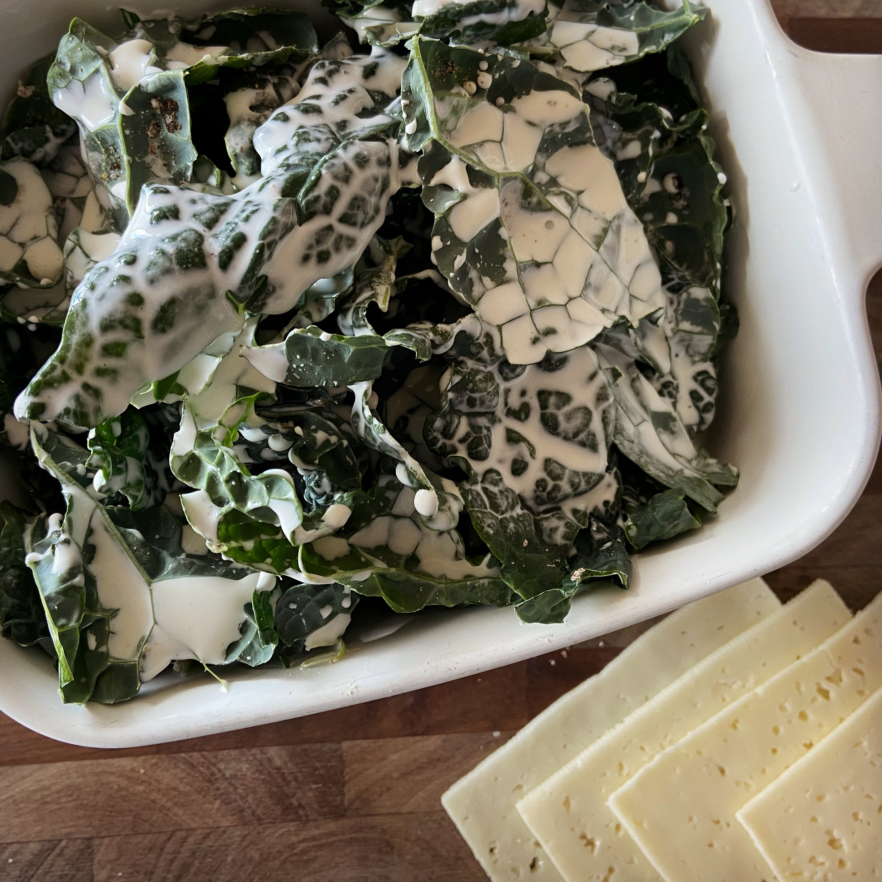 - Pile the kale in a 9 x 13-inch baking dish. Your kale should practically be spilling out and over the dish. Don’t worry, it will settle as it bakes. Season the kale with the nutmeg and salt and pepper (to taste), then carefully drizzle the cream over it. Top with cheese slices.