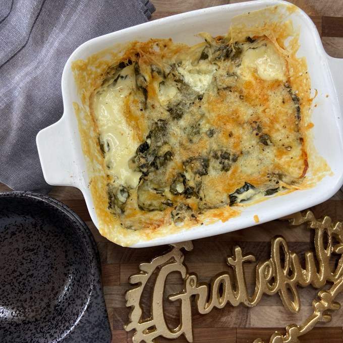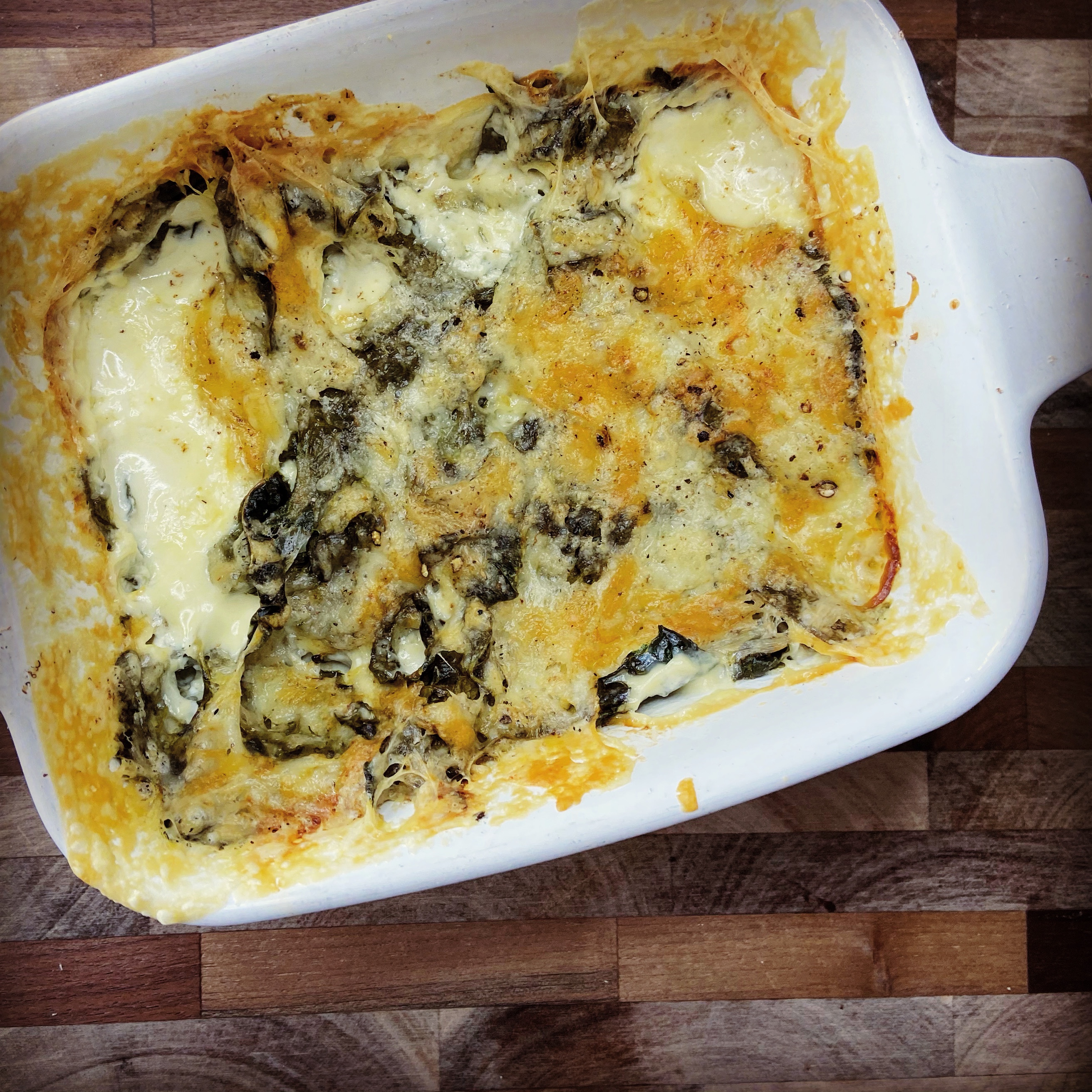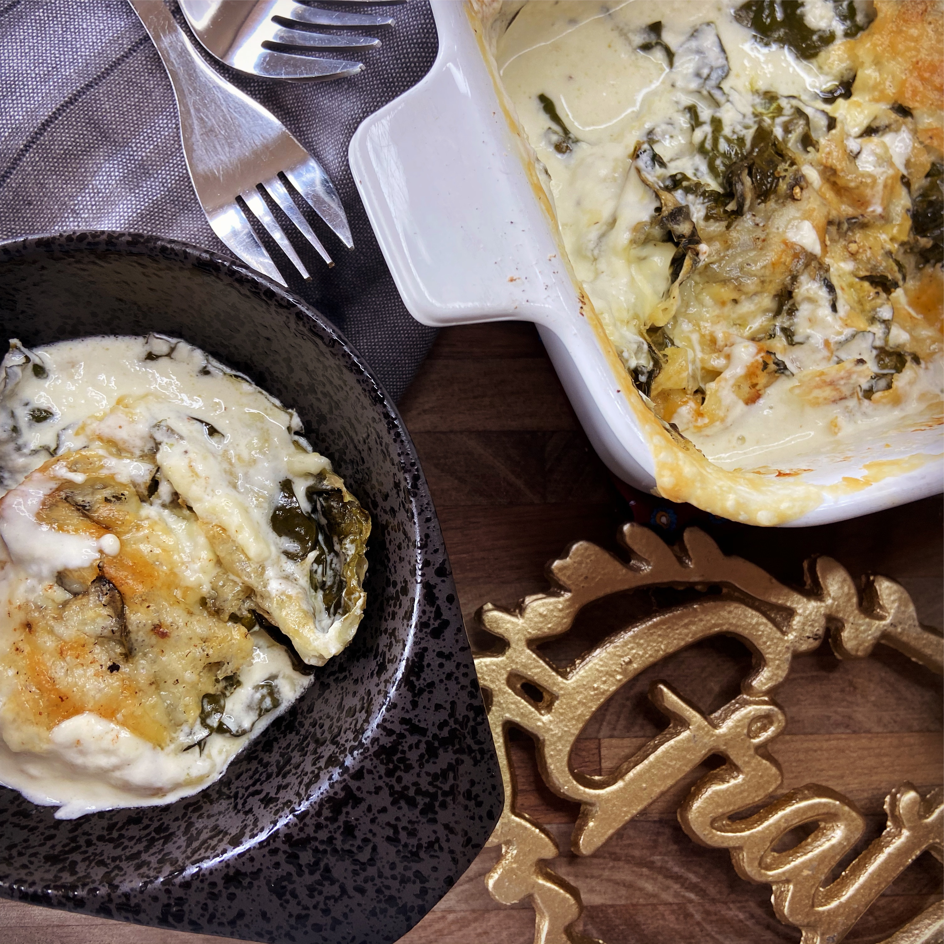 - Pile the kale in a 9 x 13-inch baking dish. Your kale should practically be spilling out and over the dish. Don’t worry, it will settle as it bakes. Season the kale with the nutmeg and salt and pepper (to taste), then carefully drizzle the cream over it. Top with cheese slices.