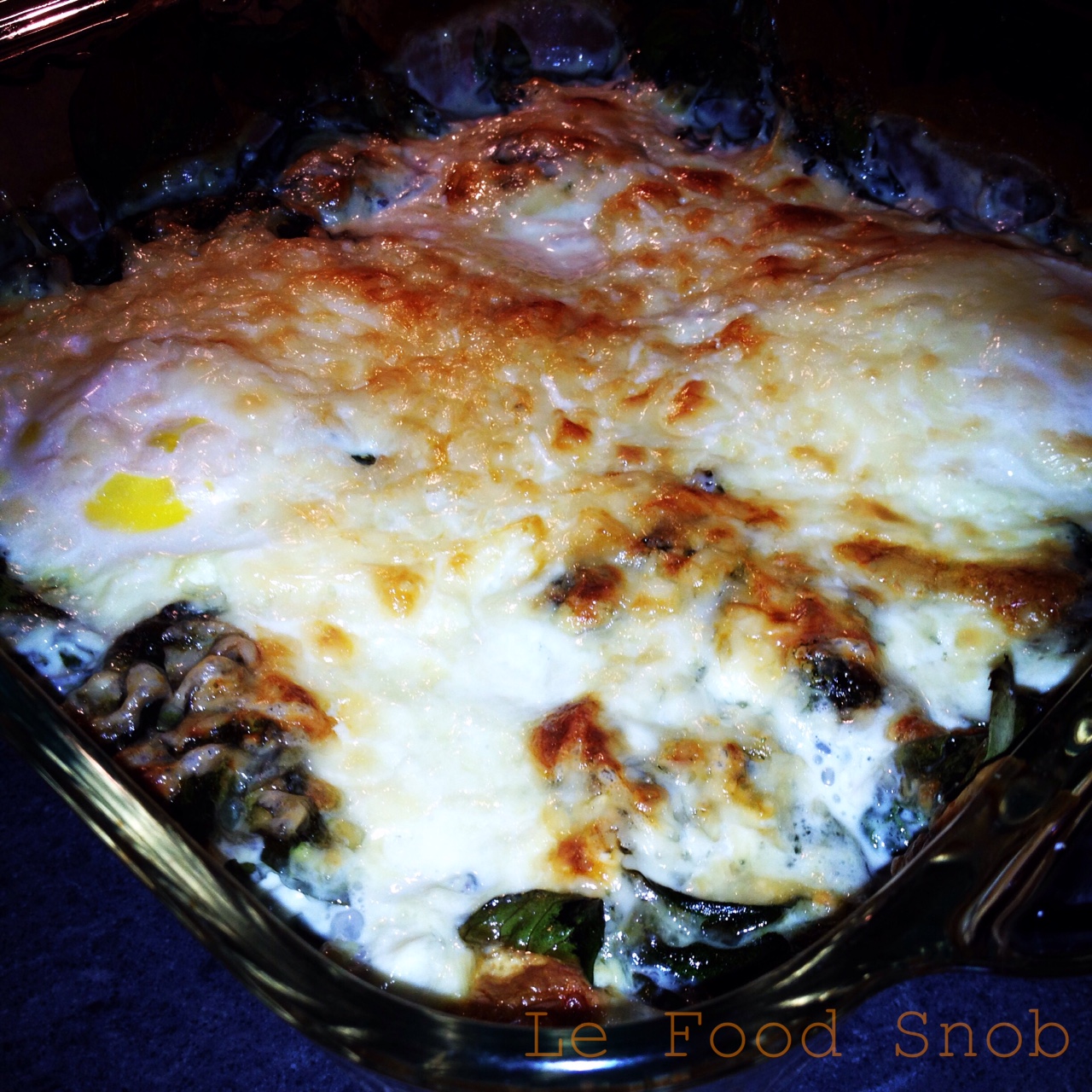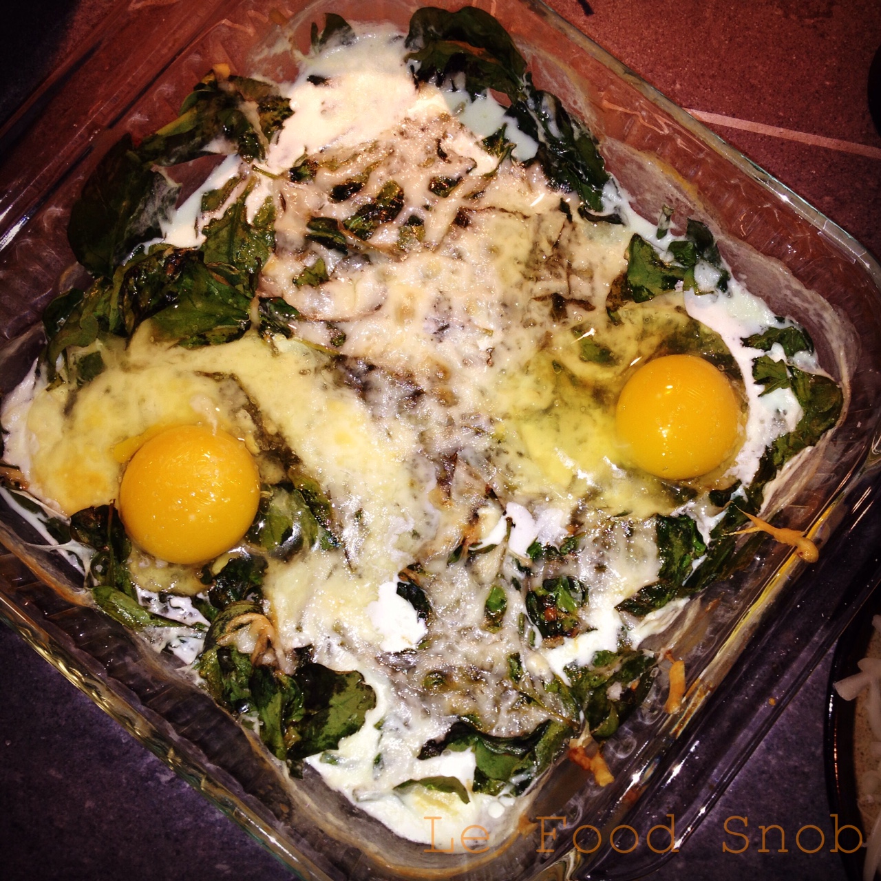 - Remove the dish from the oven and crack the eggs and then gently place them on the spinach. Sprinkle on the remaining cheese. Place in the oven and bake for another 15 or so minutes, checking the eggs in the last few minutes to see how done they are. I cooked my dish for about 40 or 45 minutes total and my yolks were completely cooked through – I was hoping for a runnier egg.