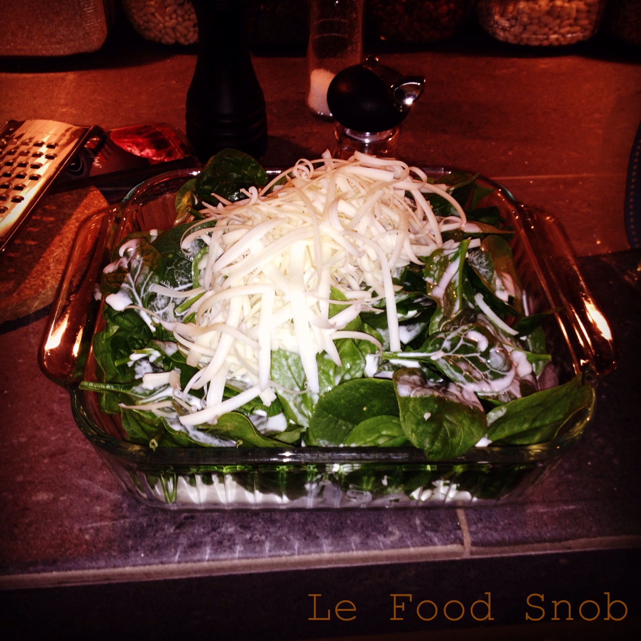 - Preheat oven to 400 degrees F. Layer fresh spinach evenly in the bottom of an 8×8-inch glass baking dish. Add about 1/2 of the grated cheese, the cream and season with salt and pepper. Bake for about 15 minutes.
