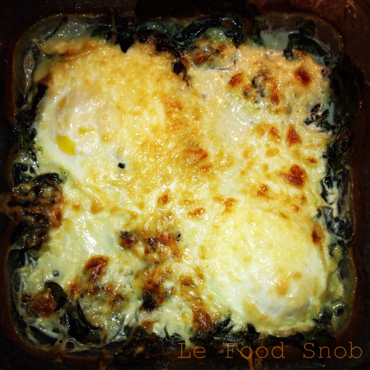After the success of last night’s dinner, I had a sneaking suspicion that you can add heavy cream to any leafy vegetable, bake it with an abundance of cheese and it will be delicious. To confirm my suspicion, I went to Google and found absolute proof in the most delicious looking recipe on the how sweet it is website. The problem with that recipe is that I couldn’t follow it directly. It sound perfectly delicious covered in browned butter breadcrumbs and served with toast, but shit. I’m on a diet. (I know that’s hard to believe but yes heavy cream and cheese are approved items on my diet–sugar and simple carbohydrates are NOT). So I tweaked the recipe a bit and made the most wonderful dinner of spinach, cream, cheese and eggs. Heaven!