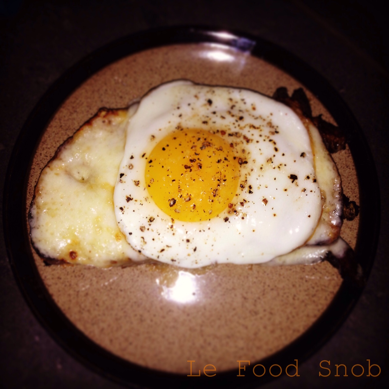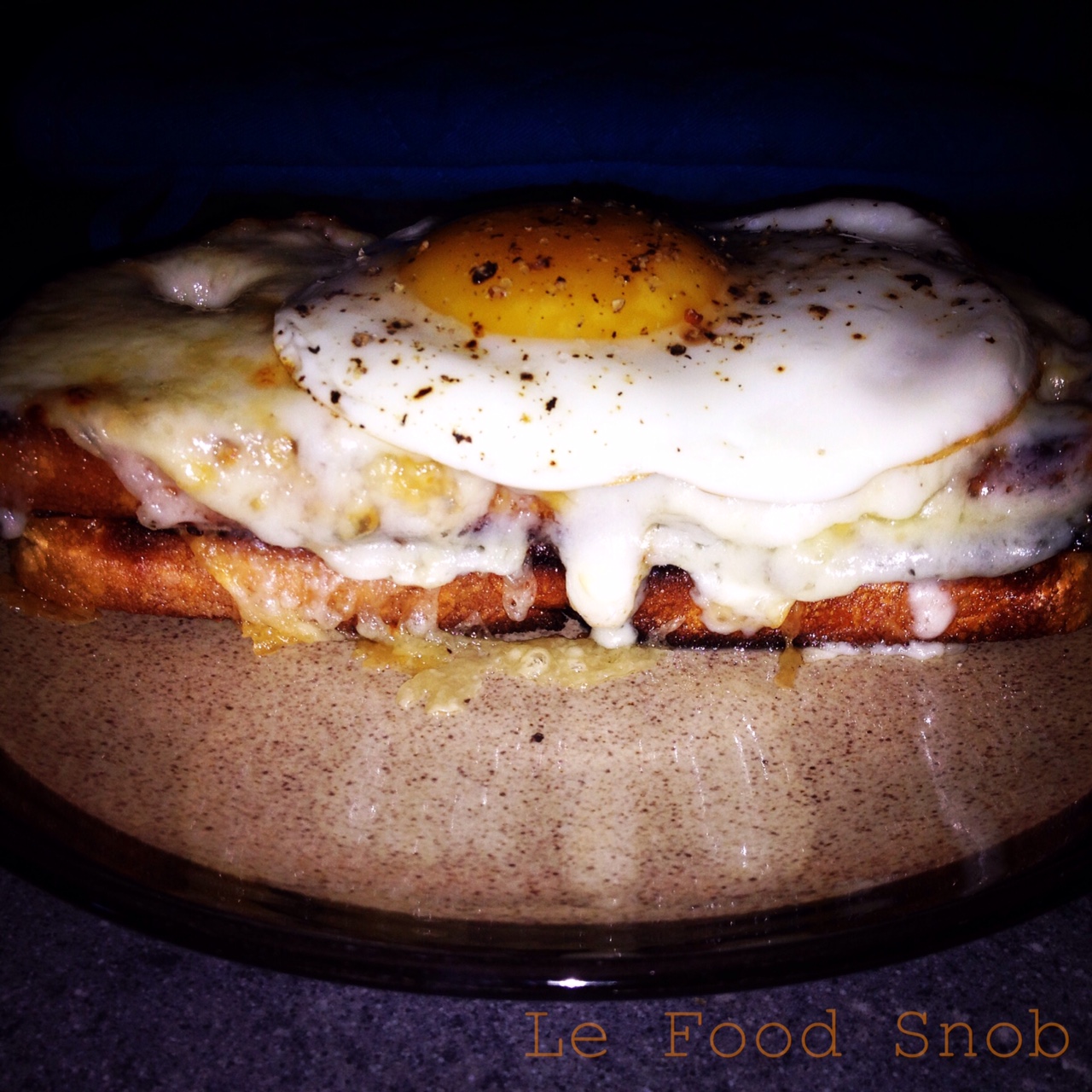 I’ve been wanting to make a bacon version of the Croque Madame for weeks now. Ever since seeing some delicious looking recipes on Pinterest. Perusing my fridge this weekend, I noticed that I had bought a package of thick-cut bacon from Trader Joe’s and never used it; and that I had most the ingredients for a Croque Madame anyway. So I hightailed my car to Trader Joe’s and grabbed a loaf of bread (I got some good-looking French bread) and loads of cheese. I reduced this recipe by half with the intent of only making two sandwiches and having lots of leftover bechamel sauce (I only had six slices of bacon or I could have been enjoying this sandwich all week!). This thing was so filling for a late lunch that I didn’t need to eat any dinner that night. (I may have indulged in dessert though…) Below is my modified version of the recipe found at SAVEUR.