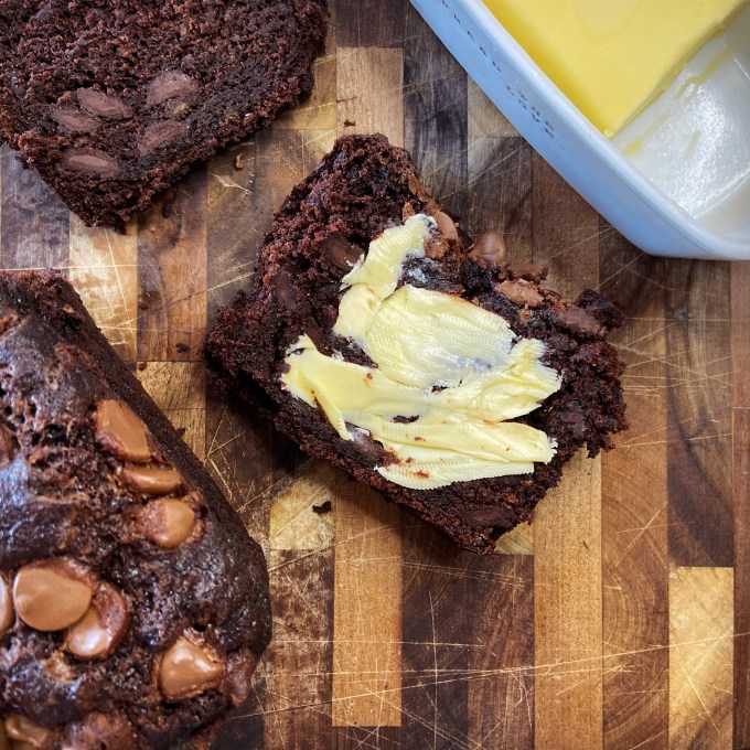 I followed Christina’s recipe to a T but I like to call the bread triple chocolate banana bread instead of double. After all, there are three different types of chocolate in/on the bread!